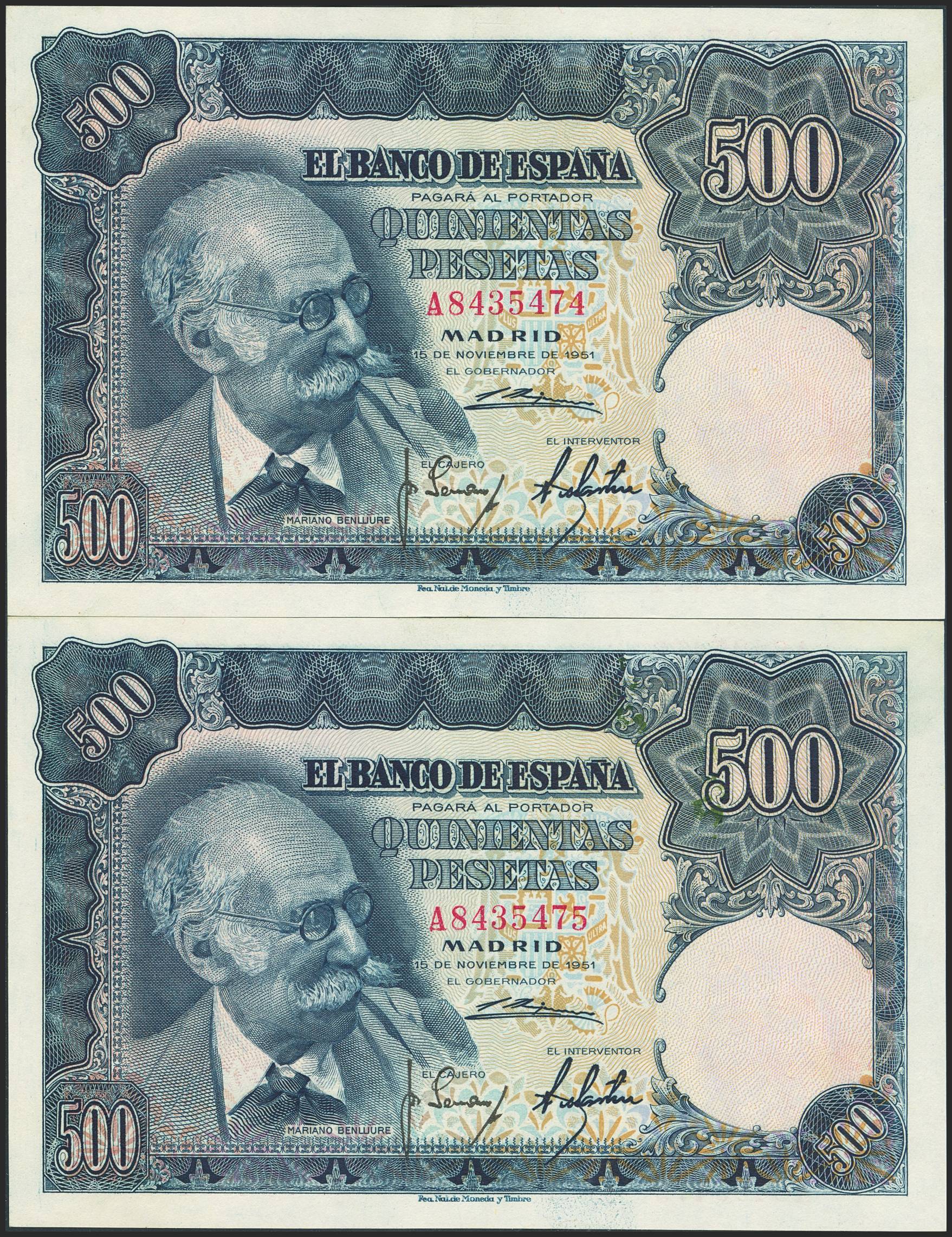500 Pesetas. November 16, 1951. Consecutive pair. Series A. (Edifil 2023: 460a). Retains much of its original finish. EF+.