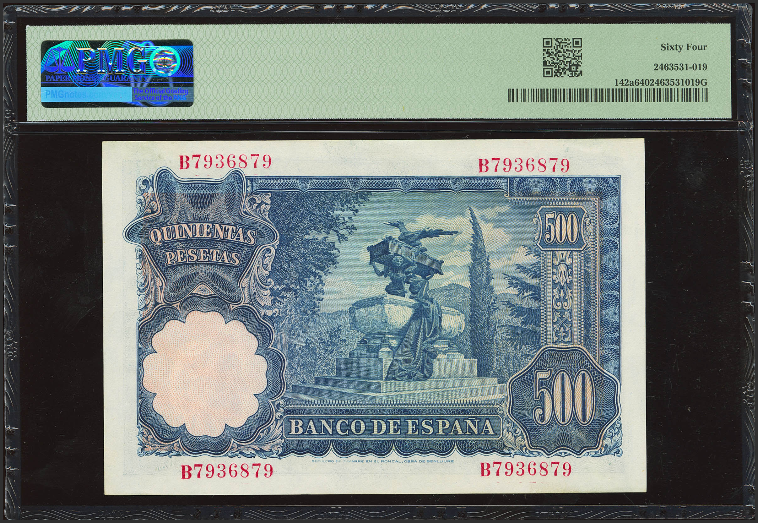 English 500 Pesetas. November 15, 1951. Series B. (Edifil 2023: 460a, Pick: 142a). Unusual. Uncirculated. PMG64 package.