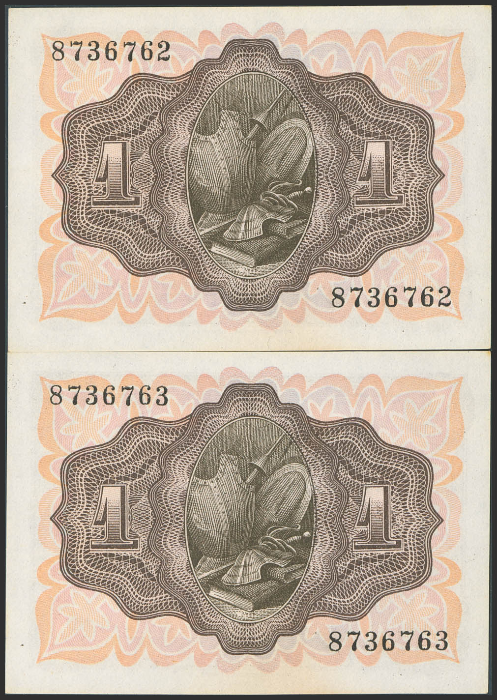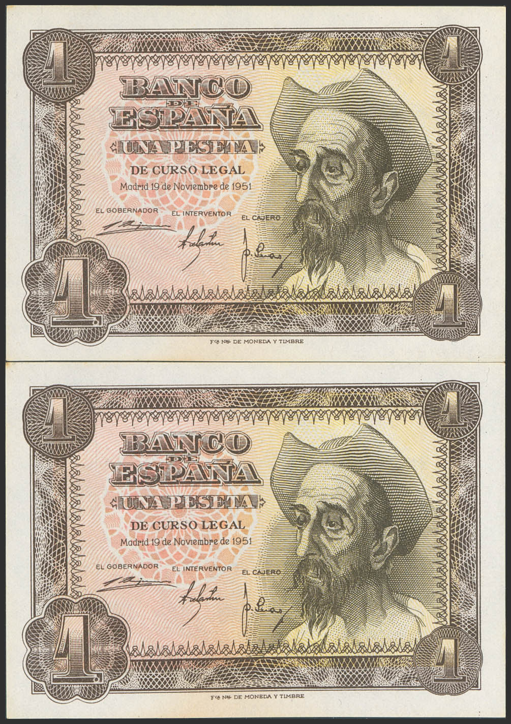1 Peseta. November 19, 1951. Consecutive pair. No series. (Edifil 2023: 461). Original finish. Uncirculated.