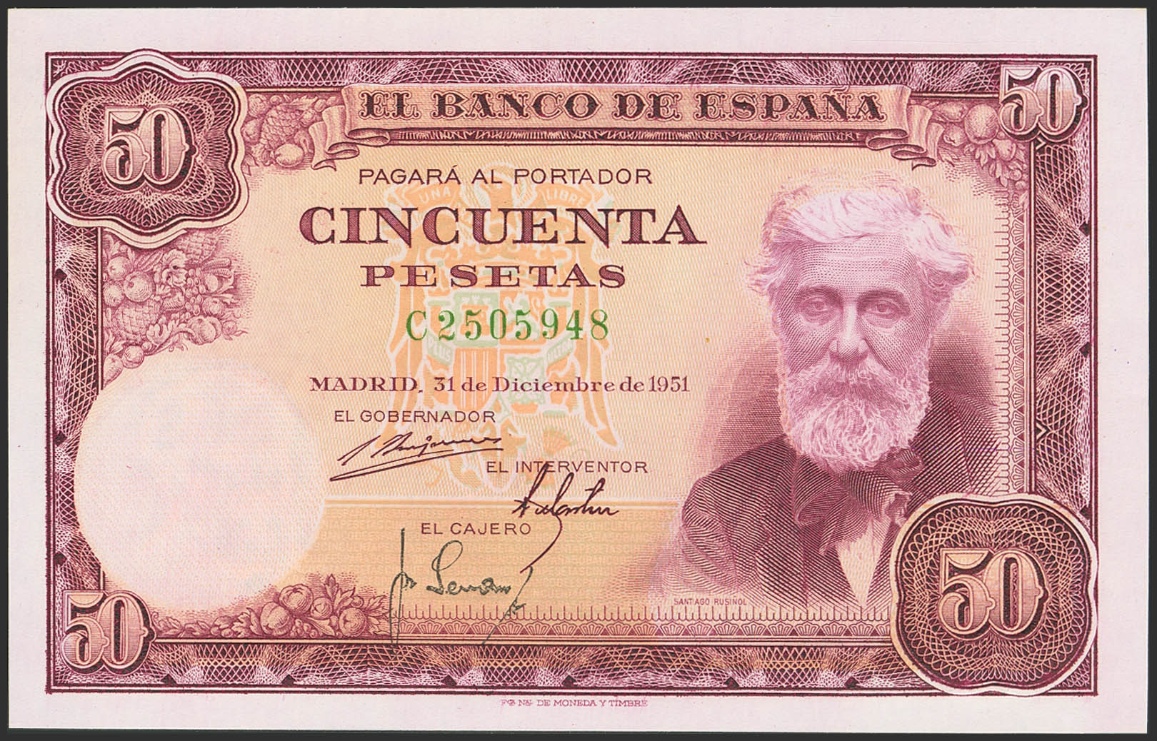 English 50 Pesetas. December 31, 1951. Series C. (Edifil 2023: 462a). Original finish. Uncirculated.