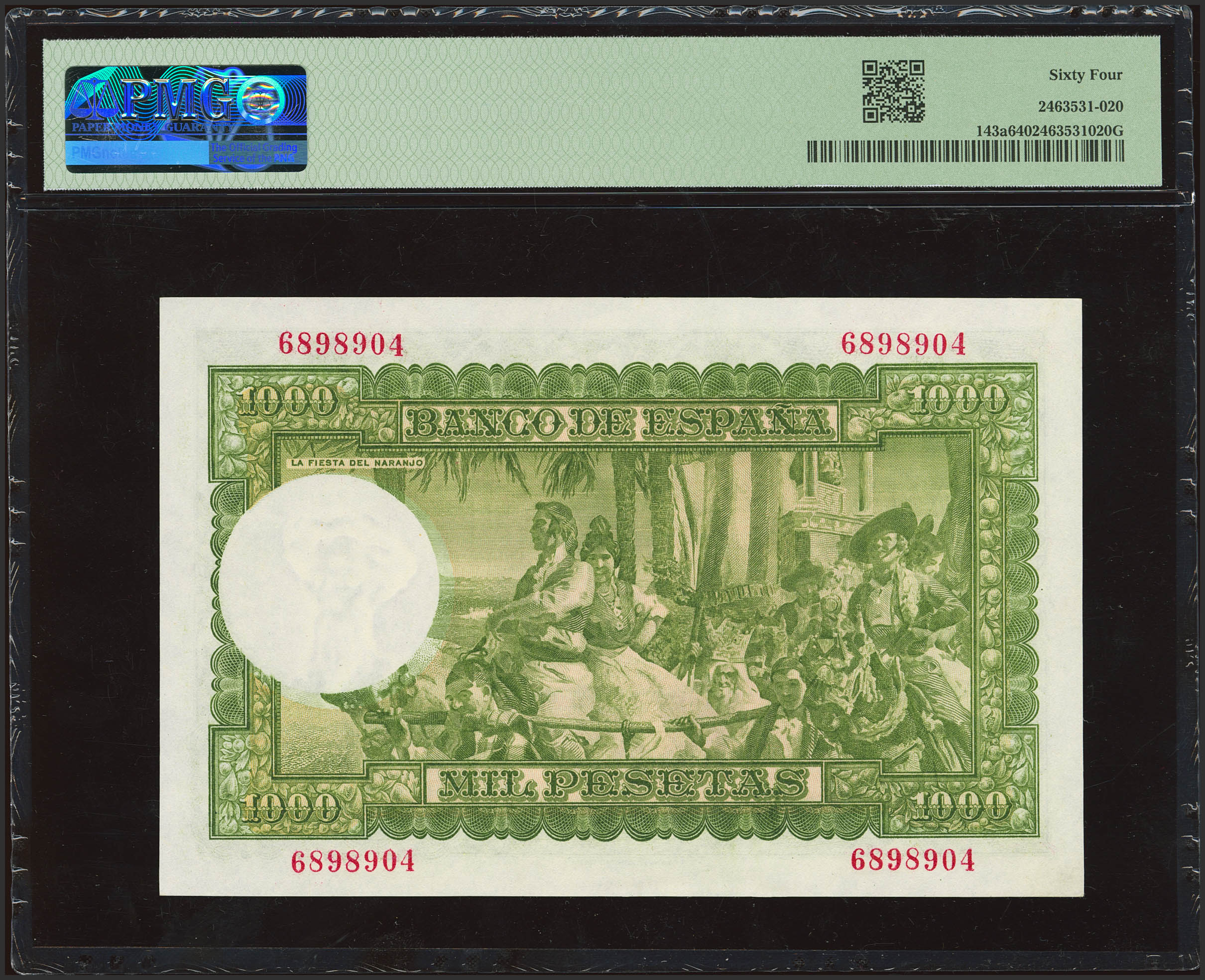 English 1000 Pesetas. December 31, 1951. No serial number. (Edifil 2023: 463, Pick: 143a). Rare in this condition. Uncirculated. PMG64 package.