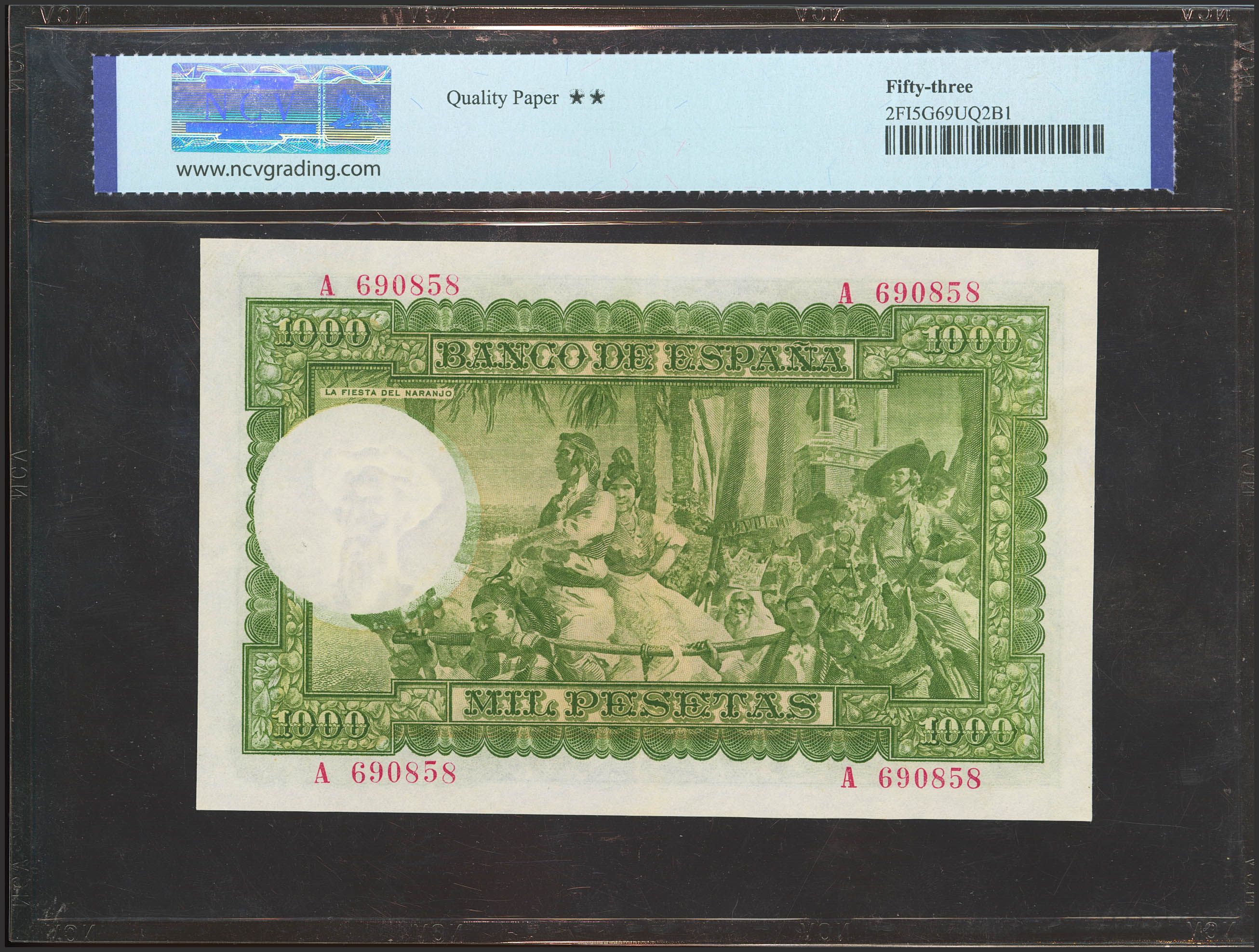 1000 Pesetas. December 31, 1951. Series A. (Edifil 2023: 463a, Pick: 143a). Extremely Fine. NCV53 encapsulation.
