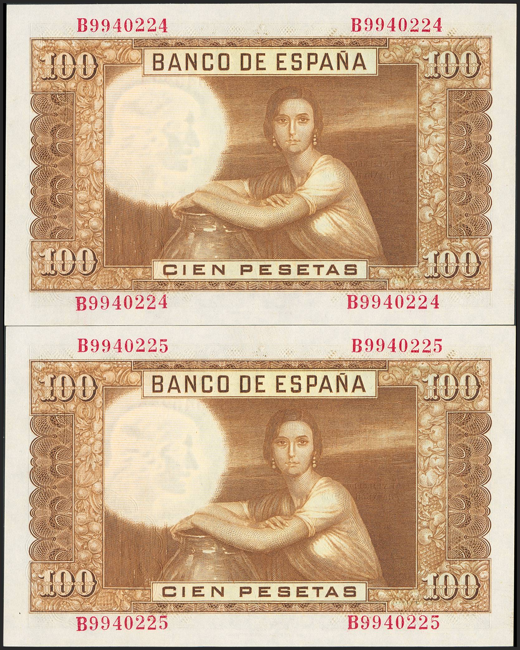 100 Pesetas. April 7, 1953. Consecutive pair. Series B. (Edifil 2023: 464b). Original finish. Uncirculated.
