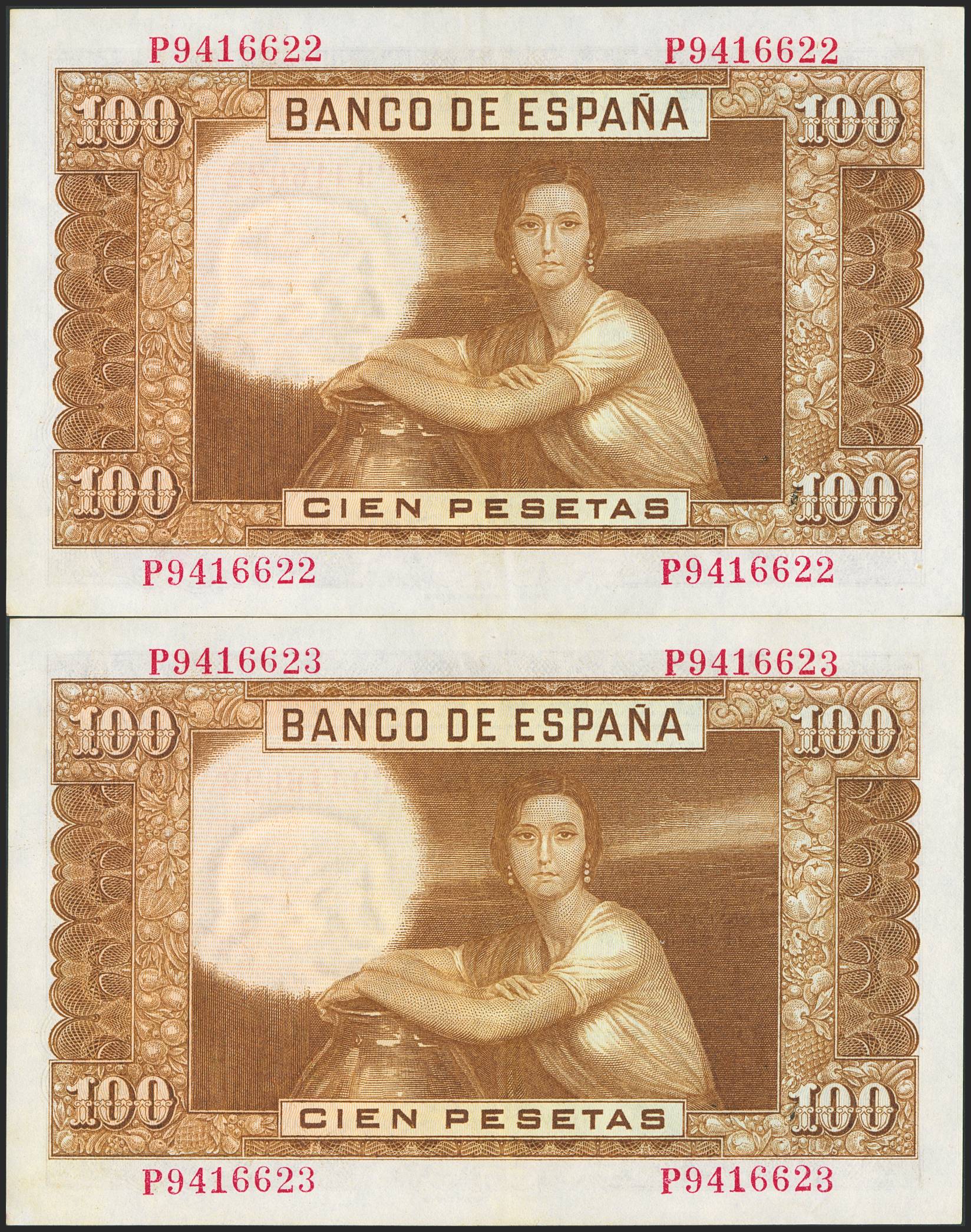 100 Pesetas. April 7, 1953. Consecutive pair. Series P. (Edifil 2023: 464b). Retains much of its original finish. EF+.