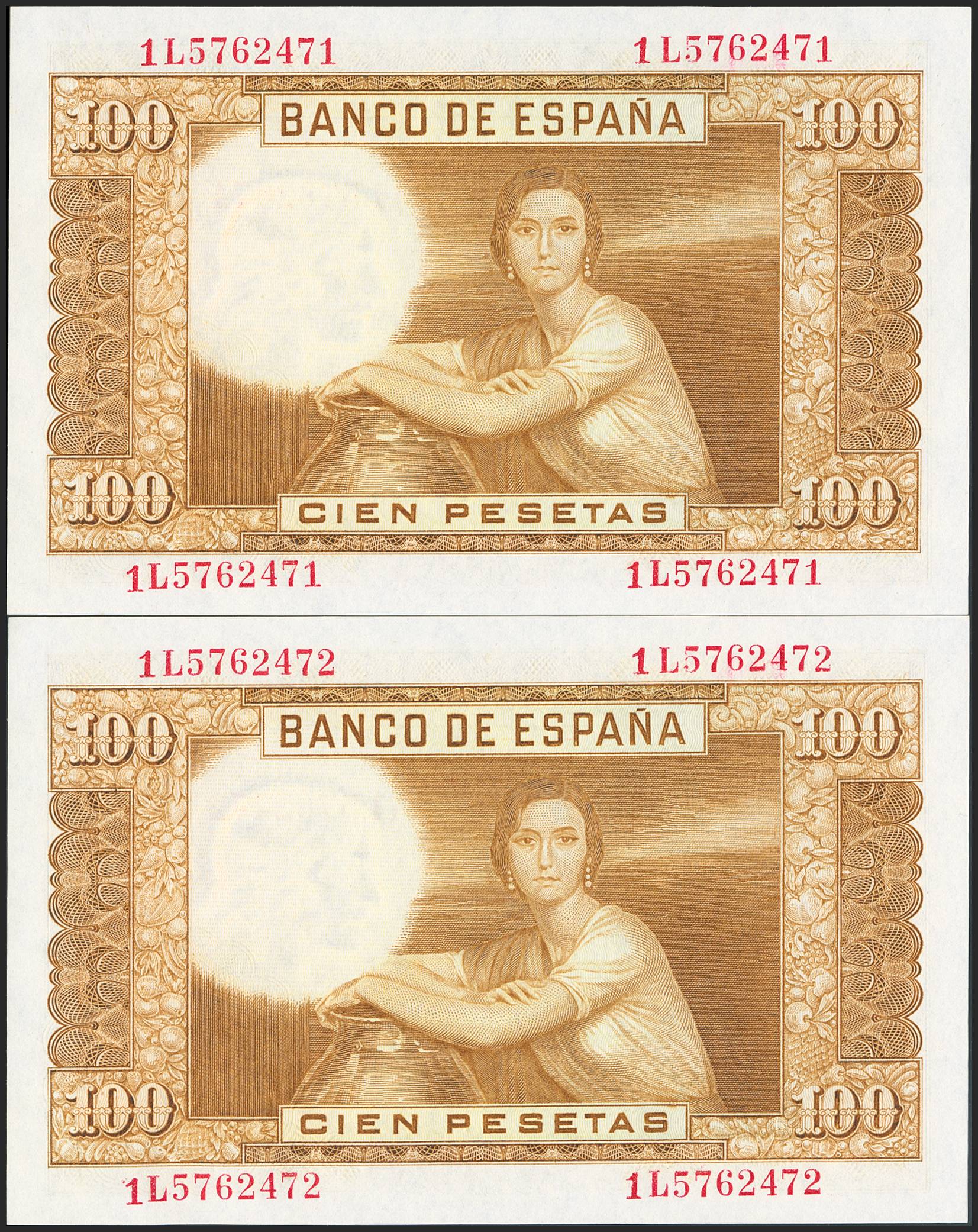 100 Pesetas. April 7, 1953. Consecutive pair. Series 1L. (Edifil 2023: 464c). Original finish. Uncirculated.