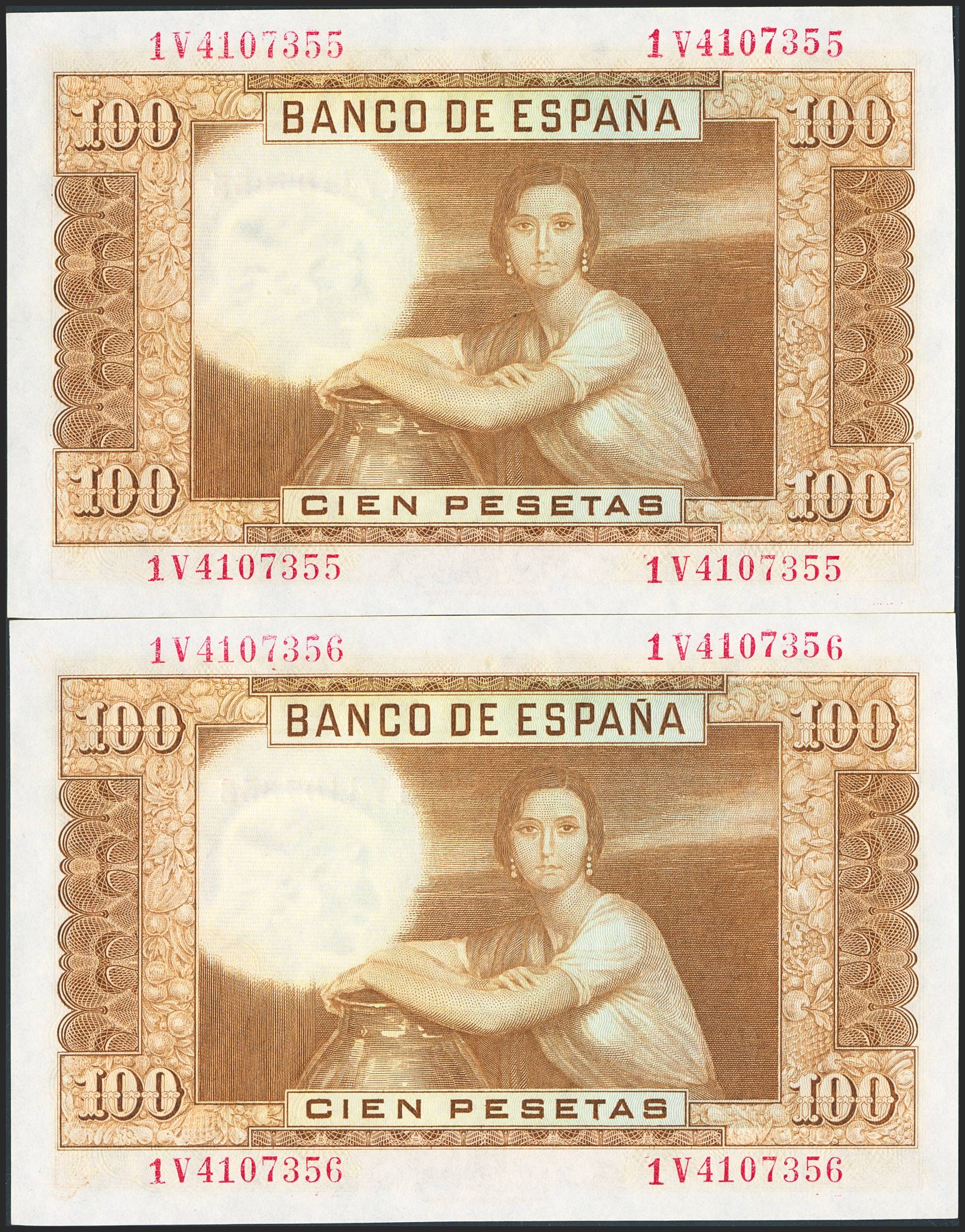 100 Pesetas. April 7, 1953. Consecutive pair. Series 1V. (Edifil 2023: 464c). Original finish. Uncirculated.