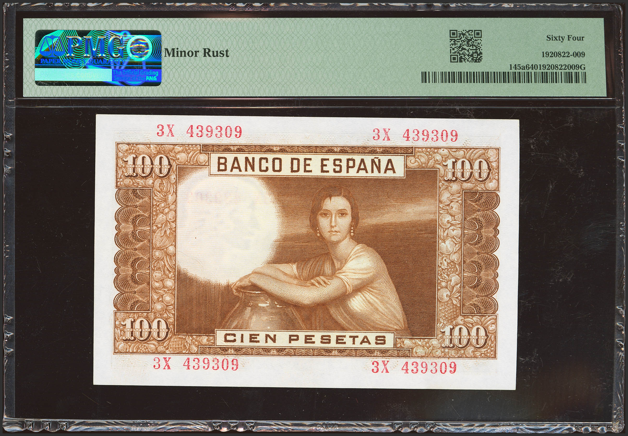 100 Pesetas. April 7, 1953. Series 3X, last series issued. (Edifil 2023: 464e, Pick: 145a). Unusual series. Uncirculated. PMG64 capsule (minor rust).