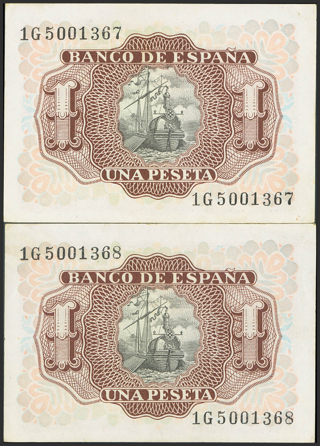 English 1 Peseta. July 22, 1953. Consecutive pair. Series 1G, last series issued. (Edifil 2023: 465b). Original condition. Uncirculated-.