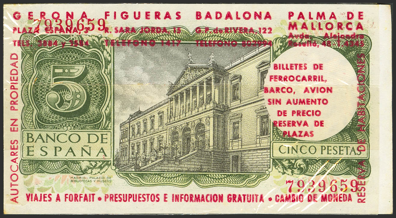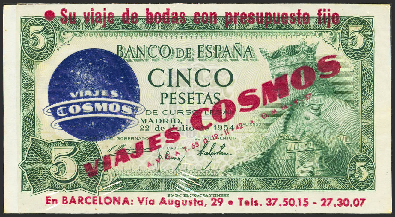 5 Pesetas. July 22, 1954. Without a serial number and with "Cosmos Travel" advertising, the banknote is presented inside a cellophane bag where the advertisement is printed. (Edifil 2023: 466). Original condition. Uncirculated-.