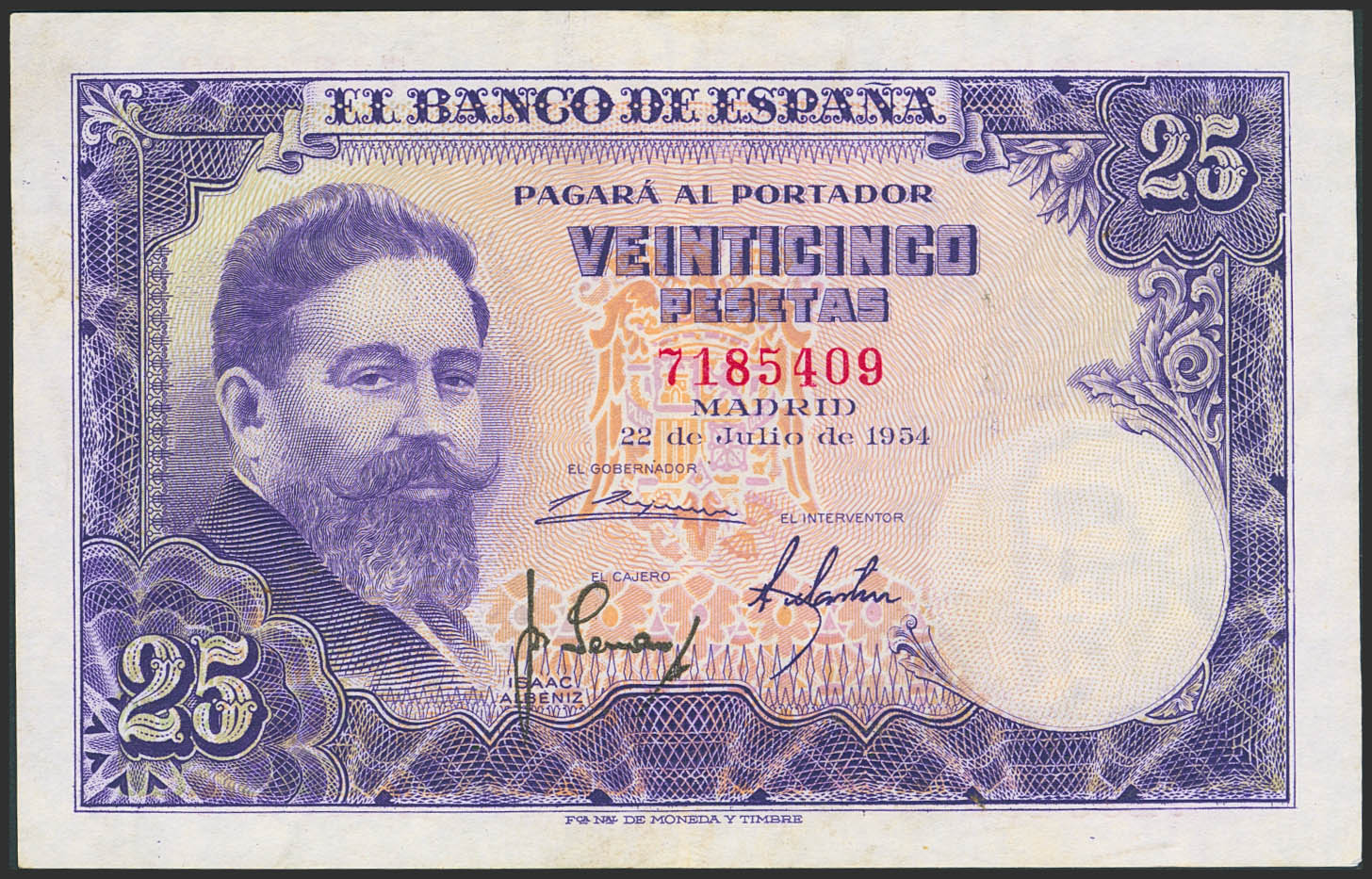 English 25 Pesetas. July 22, 1954. No series. (Edifil 2023: 467). Retains much of its original finish. EF-.
