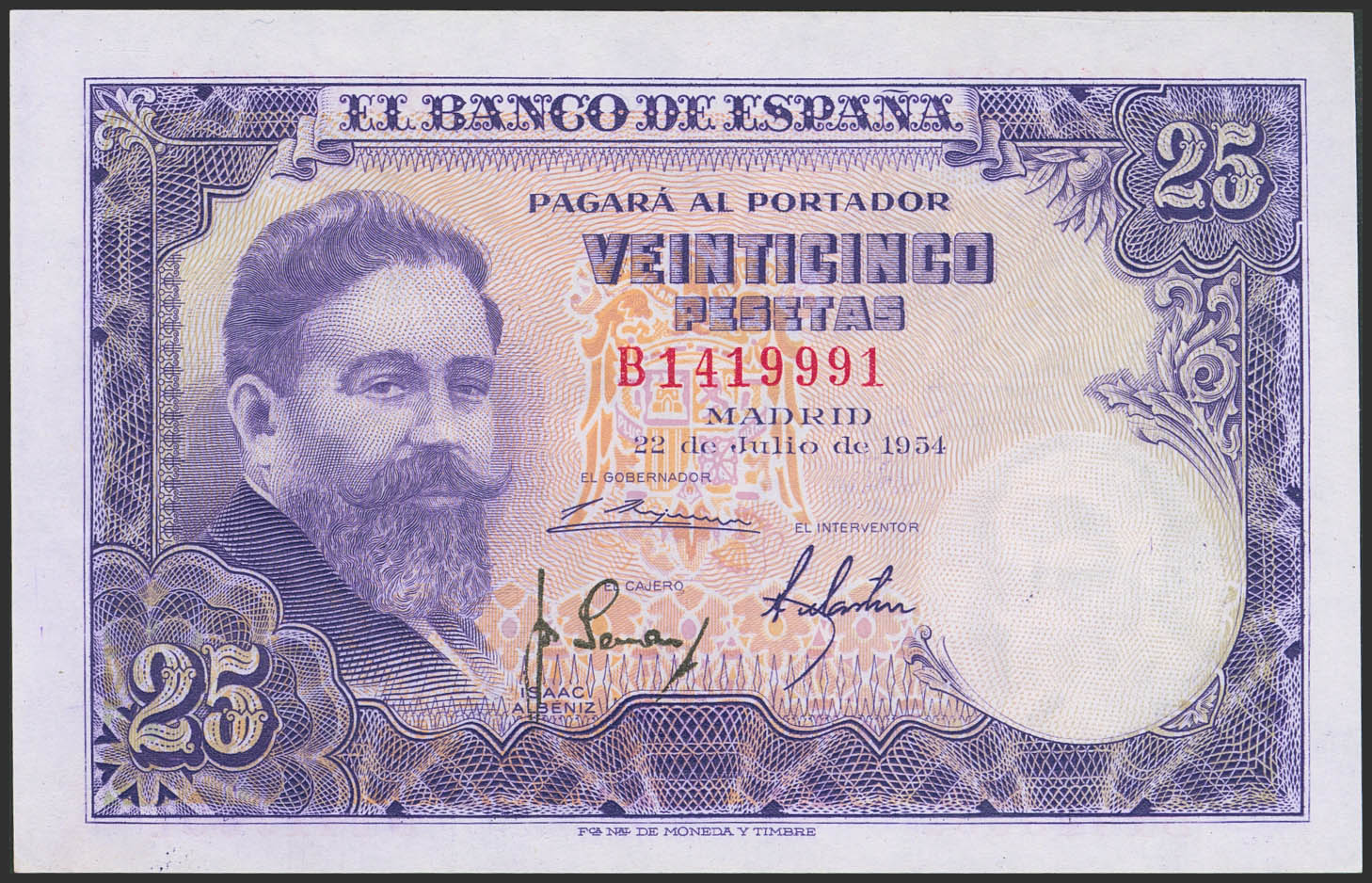 25 Pesetas. July 22, 1954. Series B. (Edifil 2023: 467a). Original finish. Uncirculated.