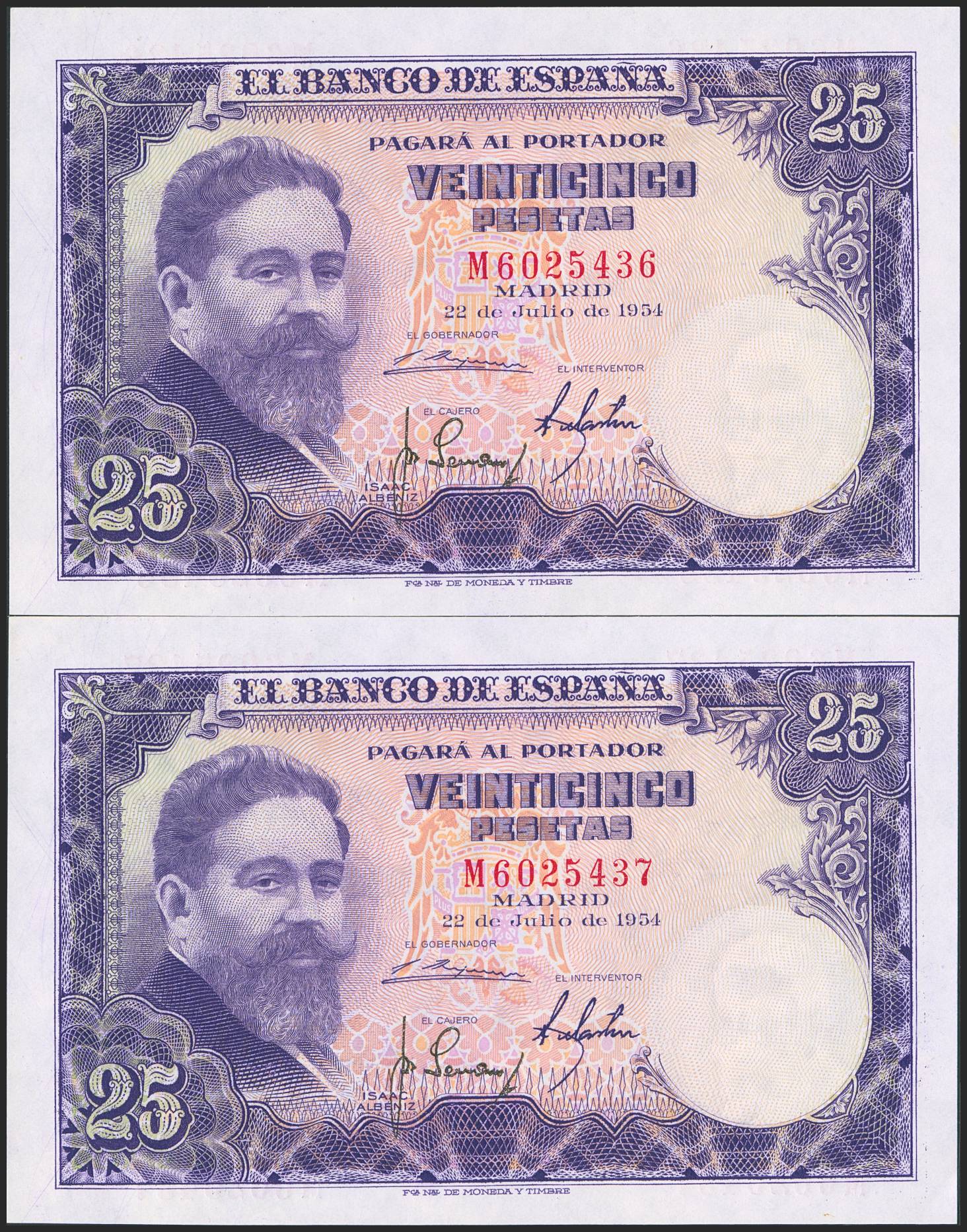 English 25 Pesetas. July 22, 1954. Consecutive pair. Series M. (Edifil 2023: 467a). Original finish. Uncirculated/Uncirculated-.