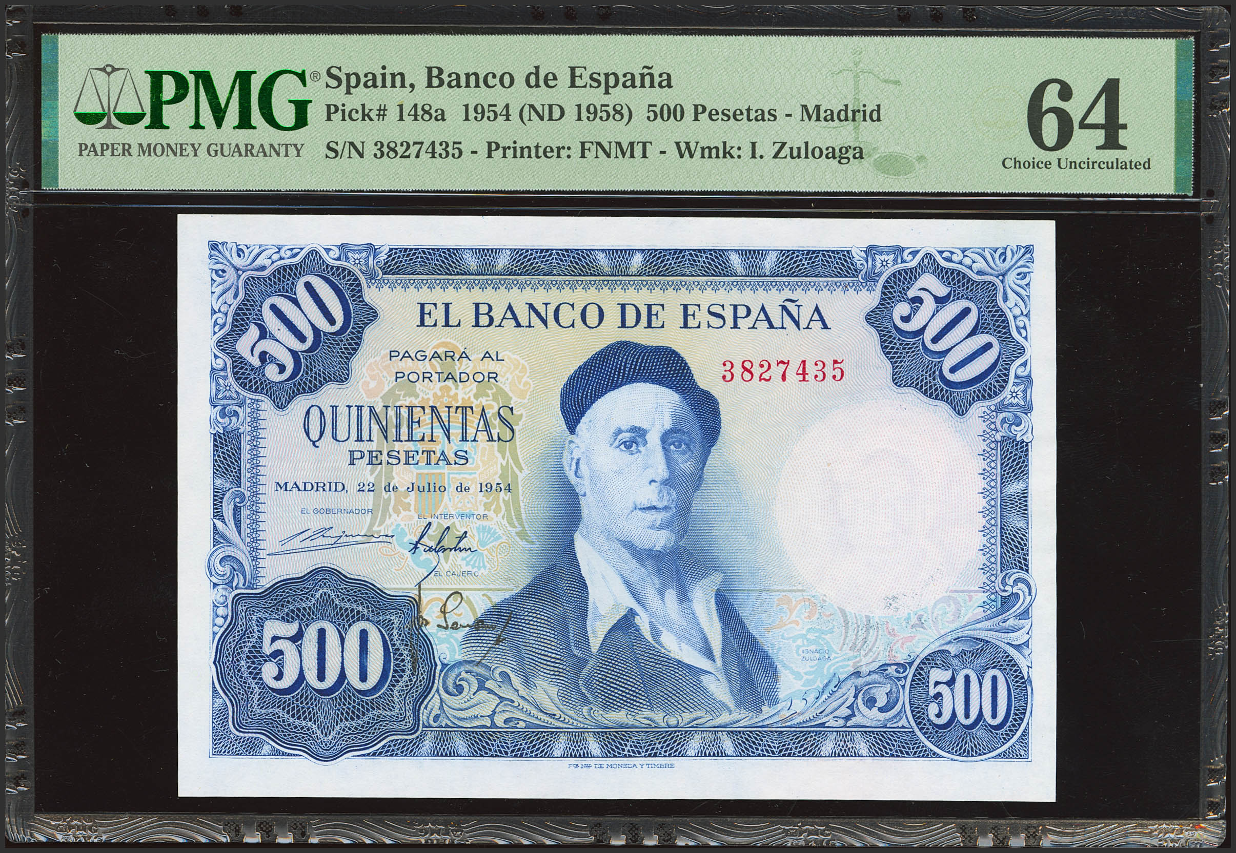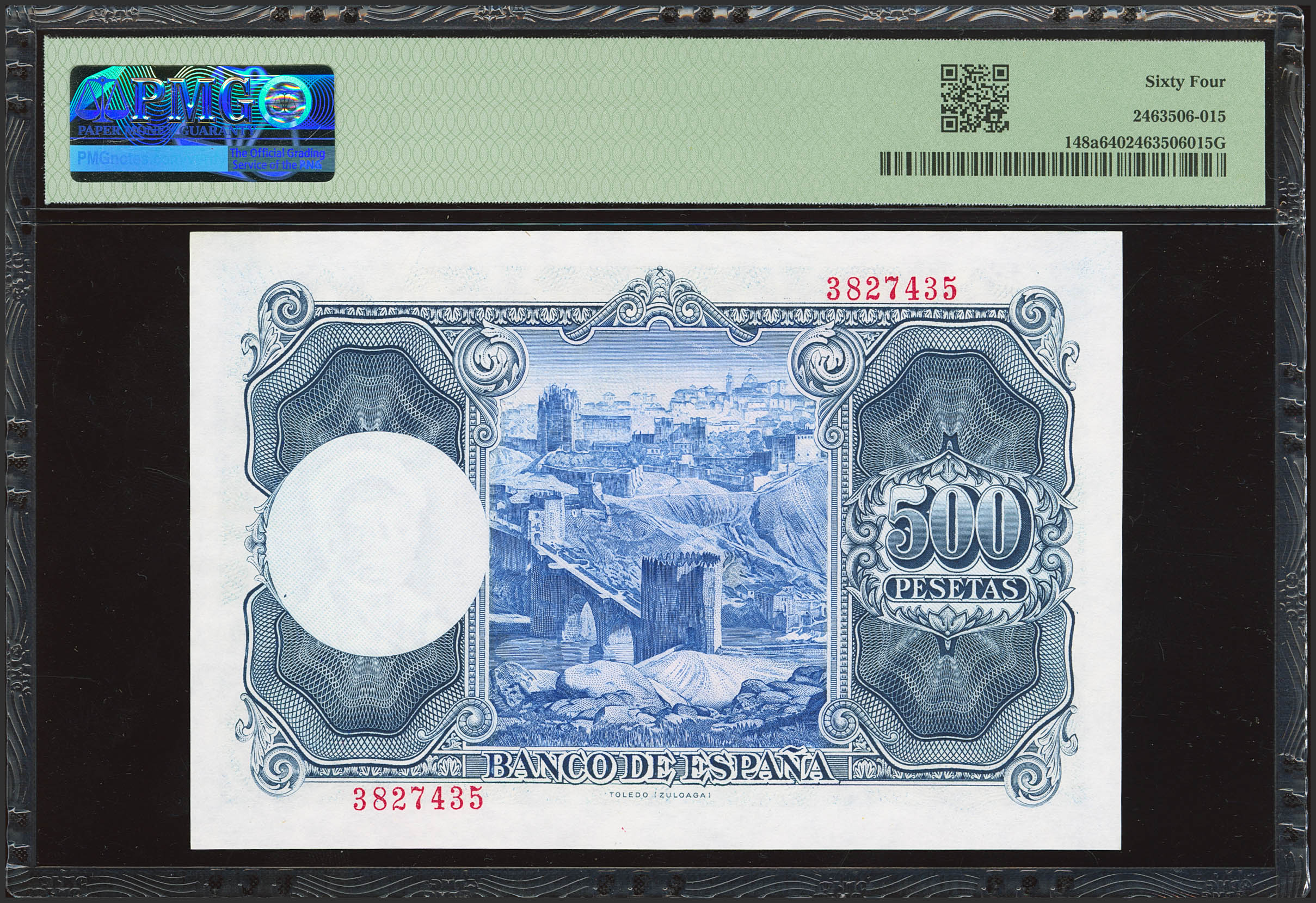 500 Pesetas. July 22, 1954. No serial number. (Edifil 2023: 468, Pick: 148a). Rare in this condition. Uncirculated. PMG64 package.