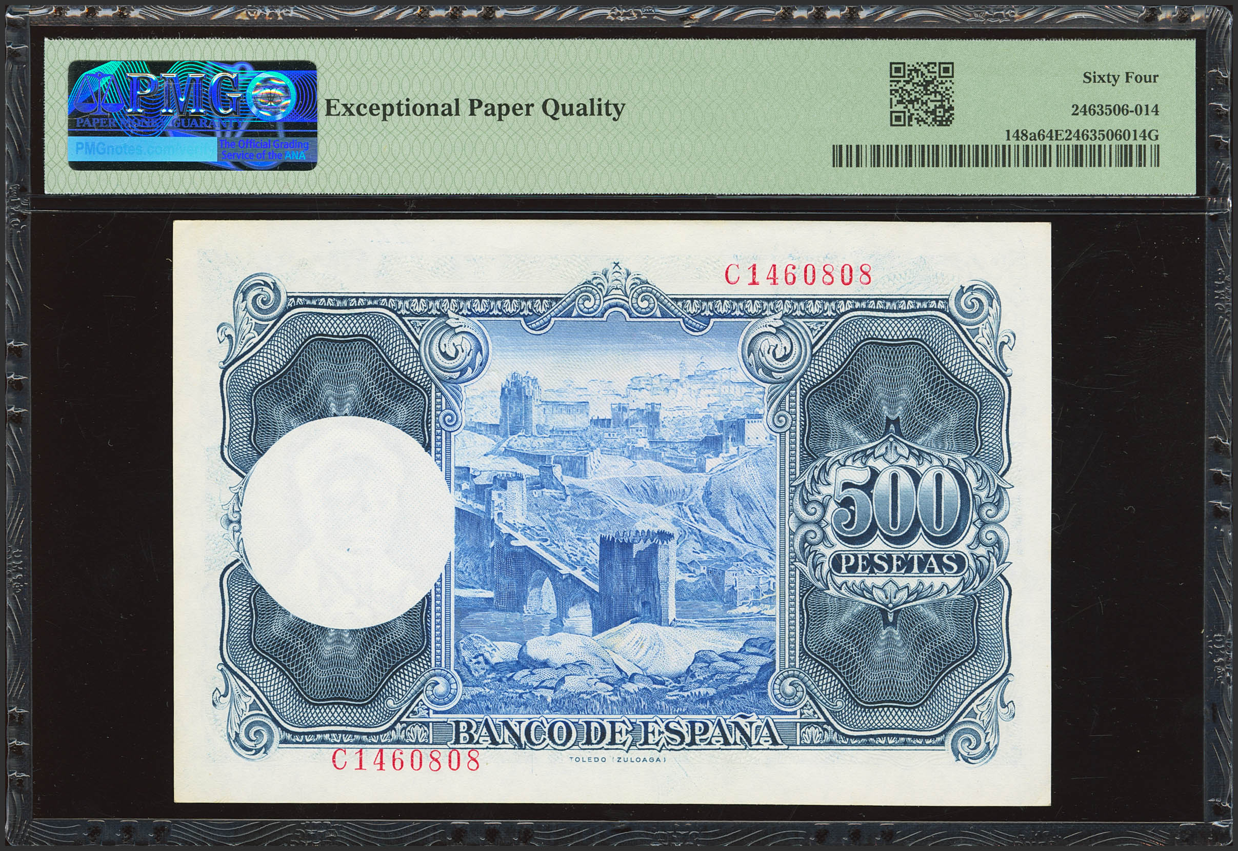 500 Pesetas. July 22, 1954. Series C. (Edifil 2023: 468b, Pick: 148a). Unusual in this exceptional quality, original finish. Uncirculated. PMG64EPQ capsule.