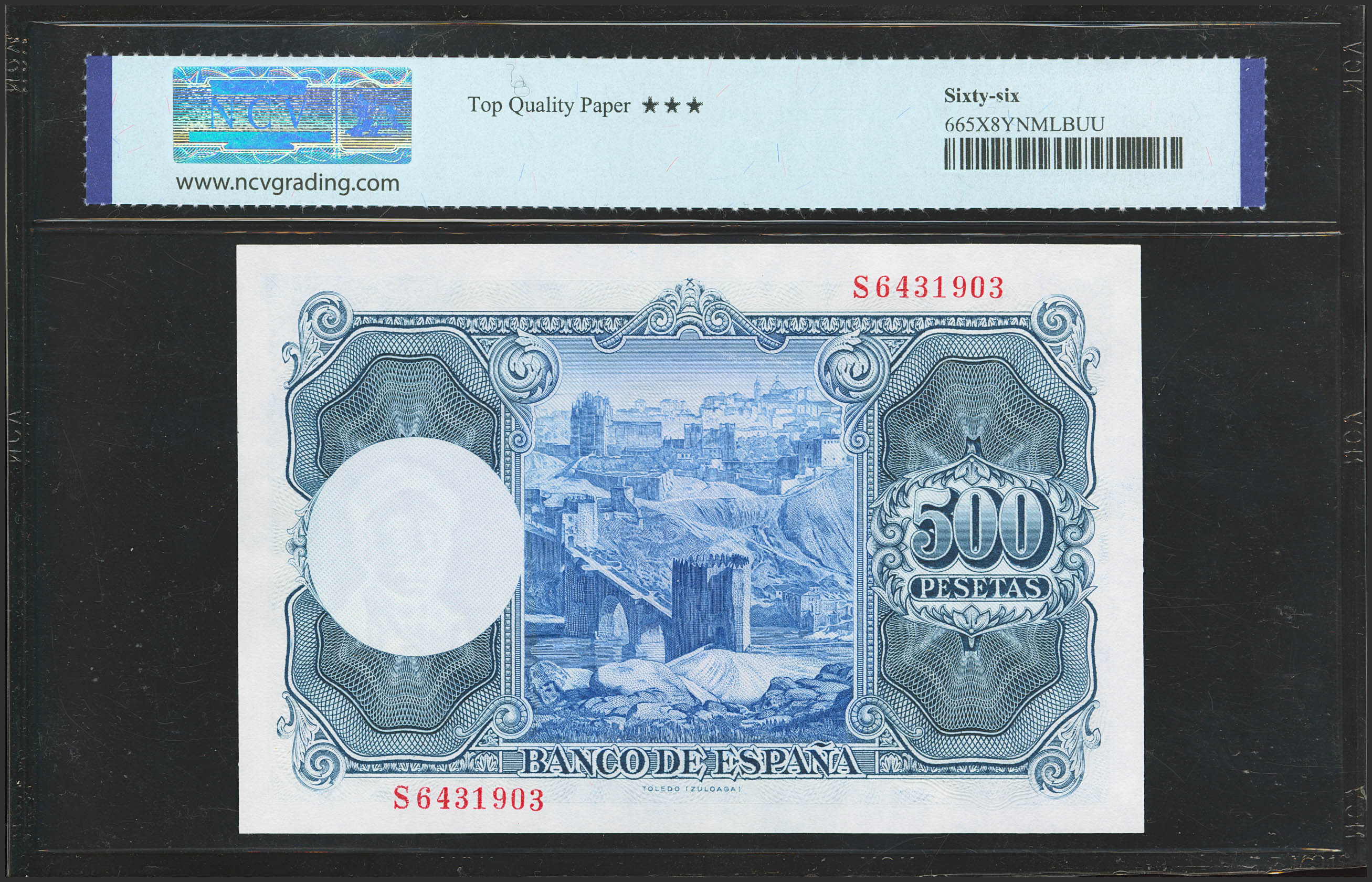 English 500 Pesetas. July 22, 1953. Series S. (Edifil 2023: 468b, Pick: 148a). Original finish. Uncirculated. NCV66TPQ encapsulation.
