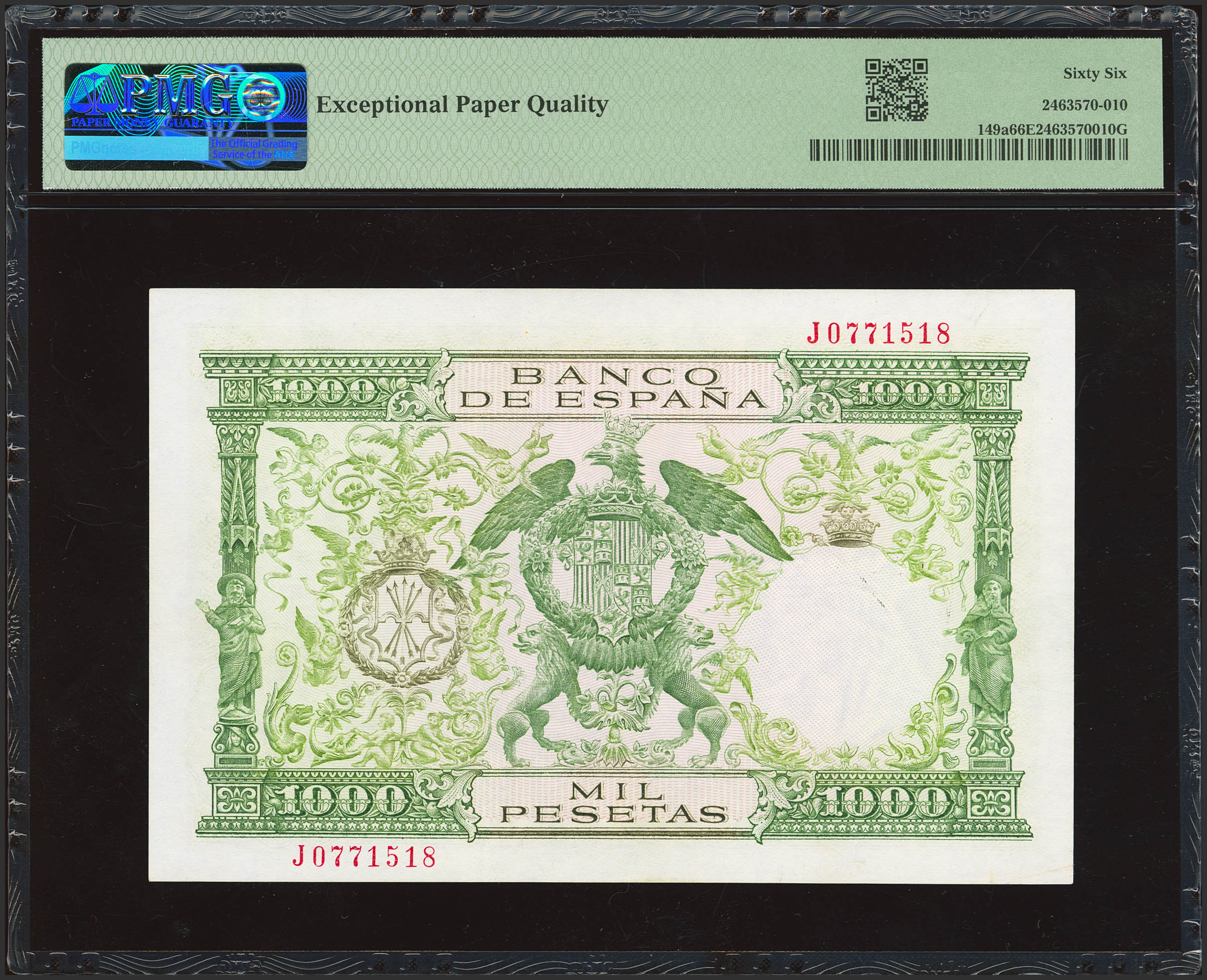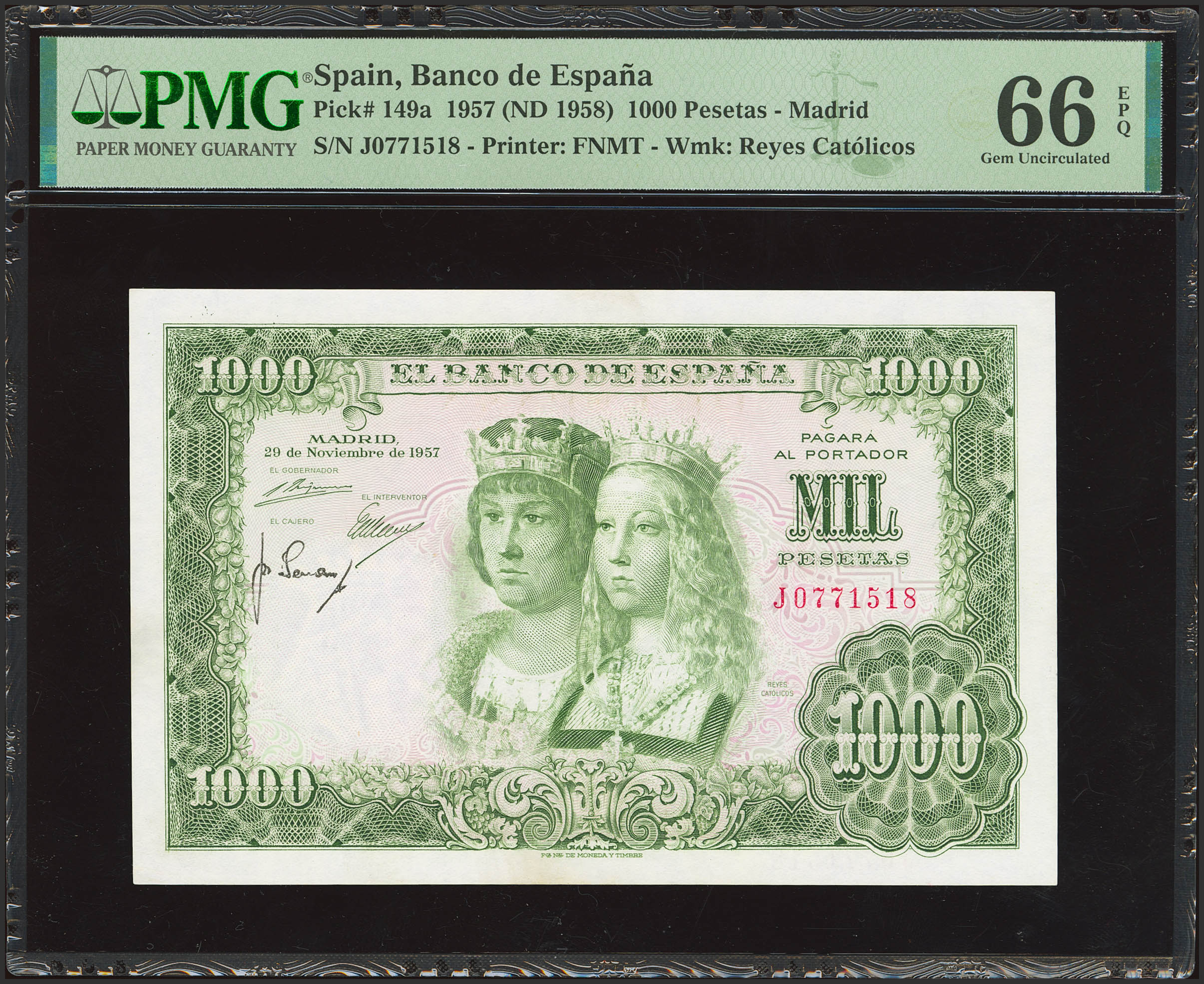 1000 Pesetas. November 29, 1957. Series J. (Edifil 2023: 469b, Pick: 149a). Very rare in this exceptional condition, original finish. Uncirculated. PMG66EPQ capsule.