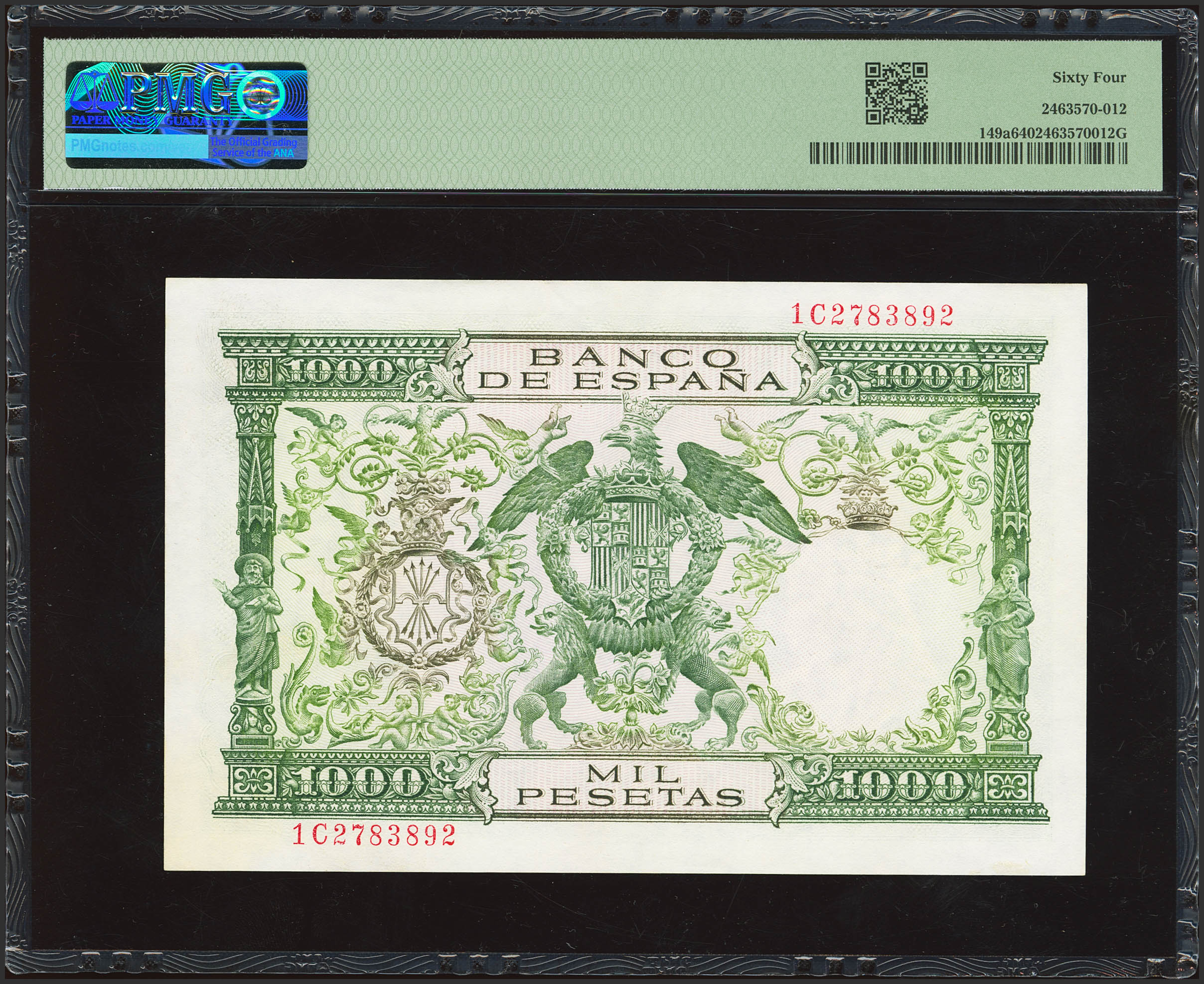 1000 Pesetas. November 29, 1957. Series 1C. (Edifil 2023: 469b, Pick: 149a). Uncirculated. PMG64 package.