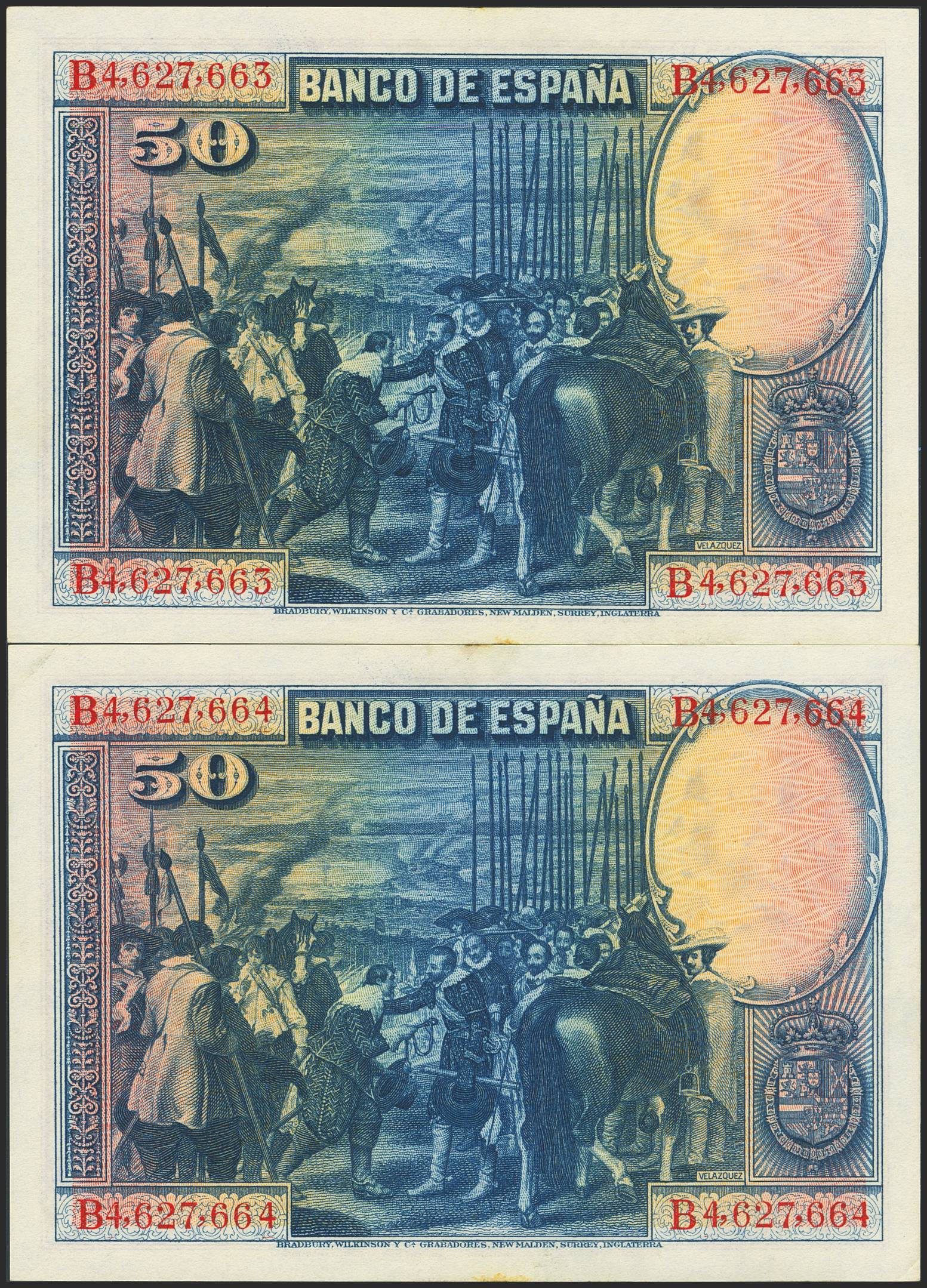 English 25 Pesetas. August 15, 1928. Consecutive pair. Series B. (Edifil 2023: 354). Retains much of its original finish. EF+.