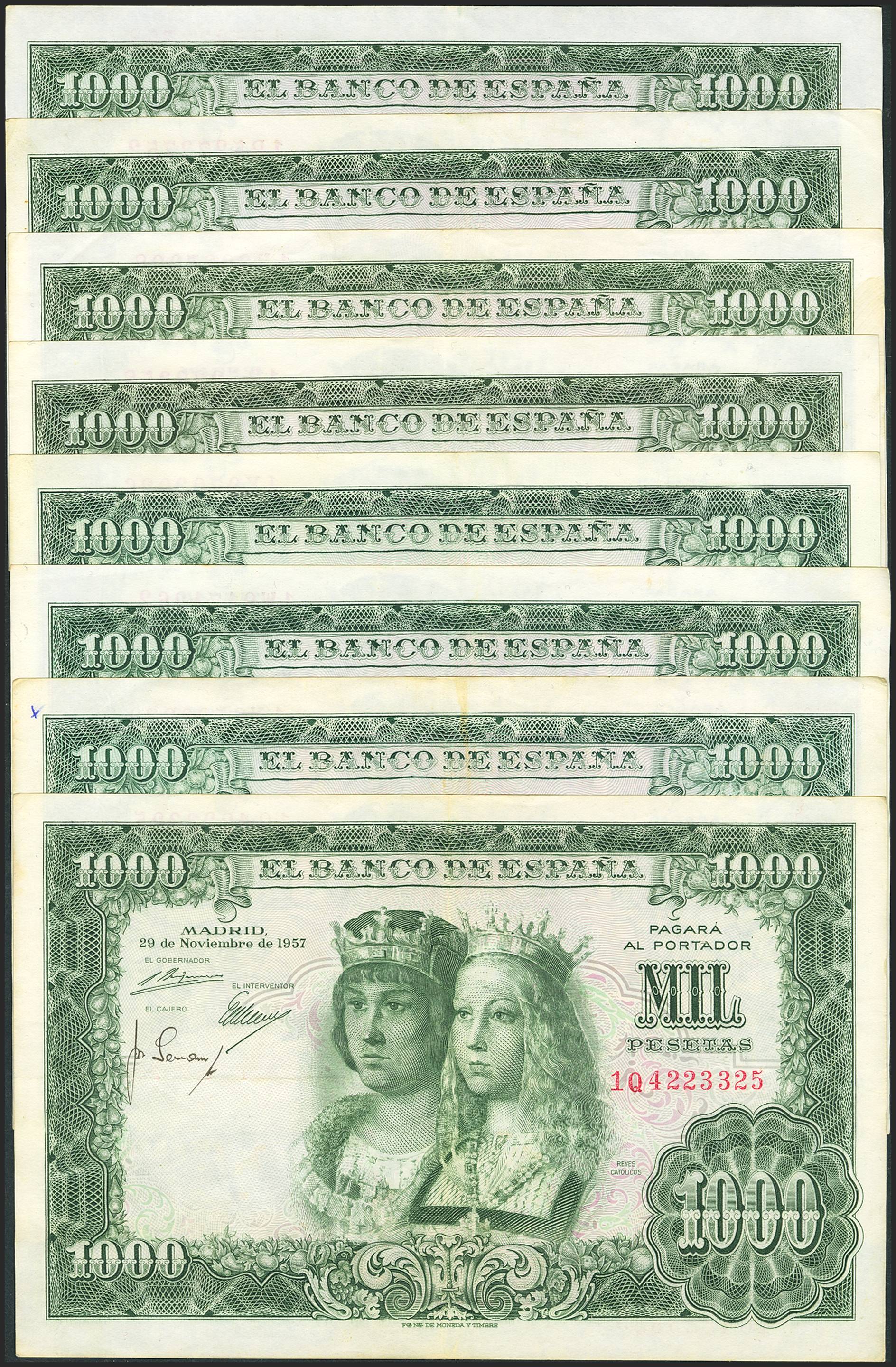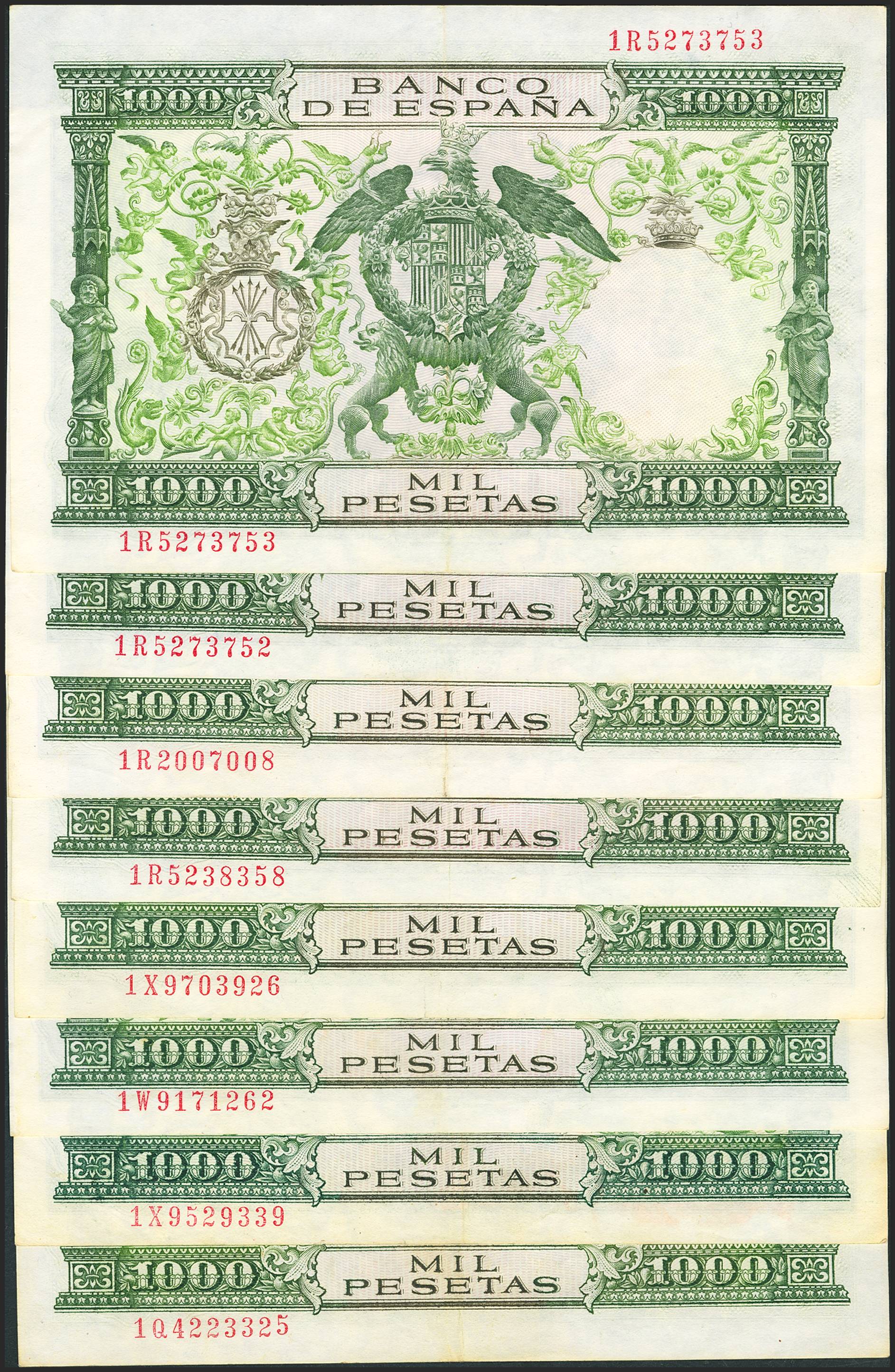English Set of 8 1000 Pesetas banknotes issued on November 29, 1957, with series 1Q, 1W and 1X. (Edifil 2023: 469b). TO BE EXAMINED.