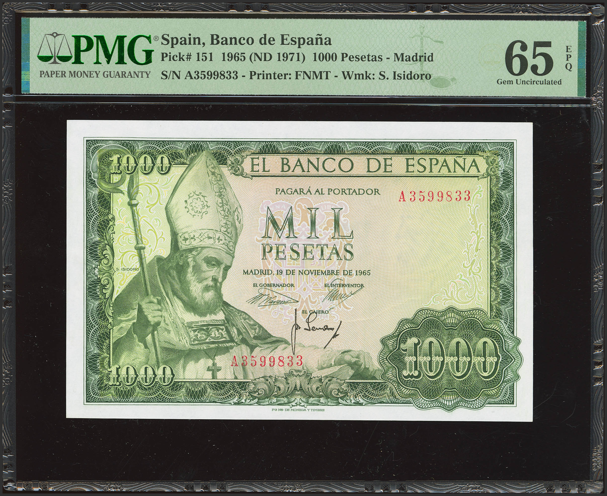 1000 Pesetas. November 19, 1965. Series A. (Edifil 2023: 471a, Pick: 151). Rare series, especially in this exceptional condition, original finish. Uncirculated. Encapsulated PMG65EPQ.