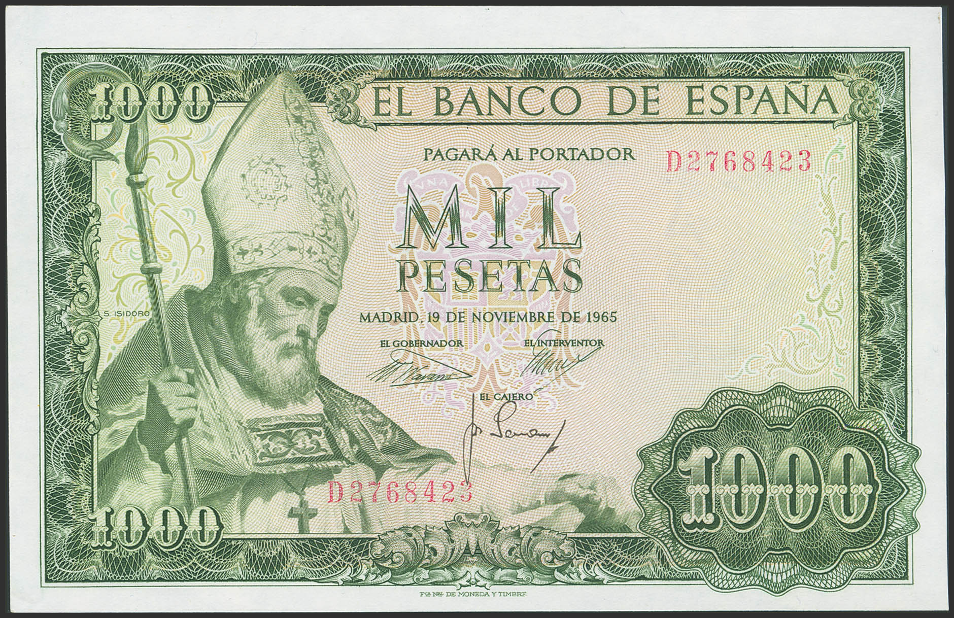 English 1000 Pesetas. November 19, 1965. Series D. (Edifil 2023: 471b). Original finish. Uncirculated-.
