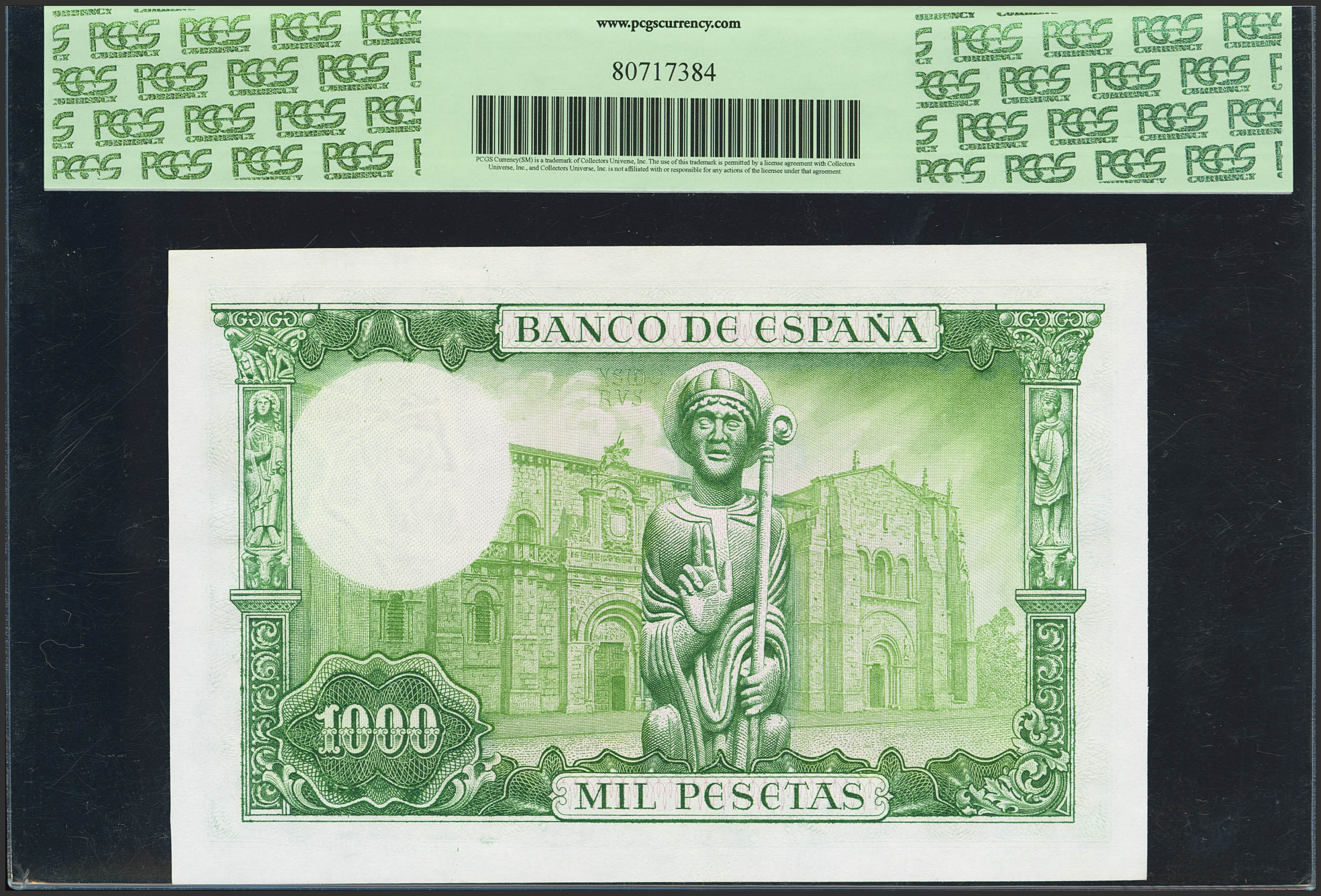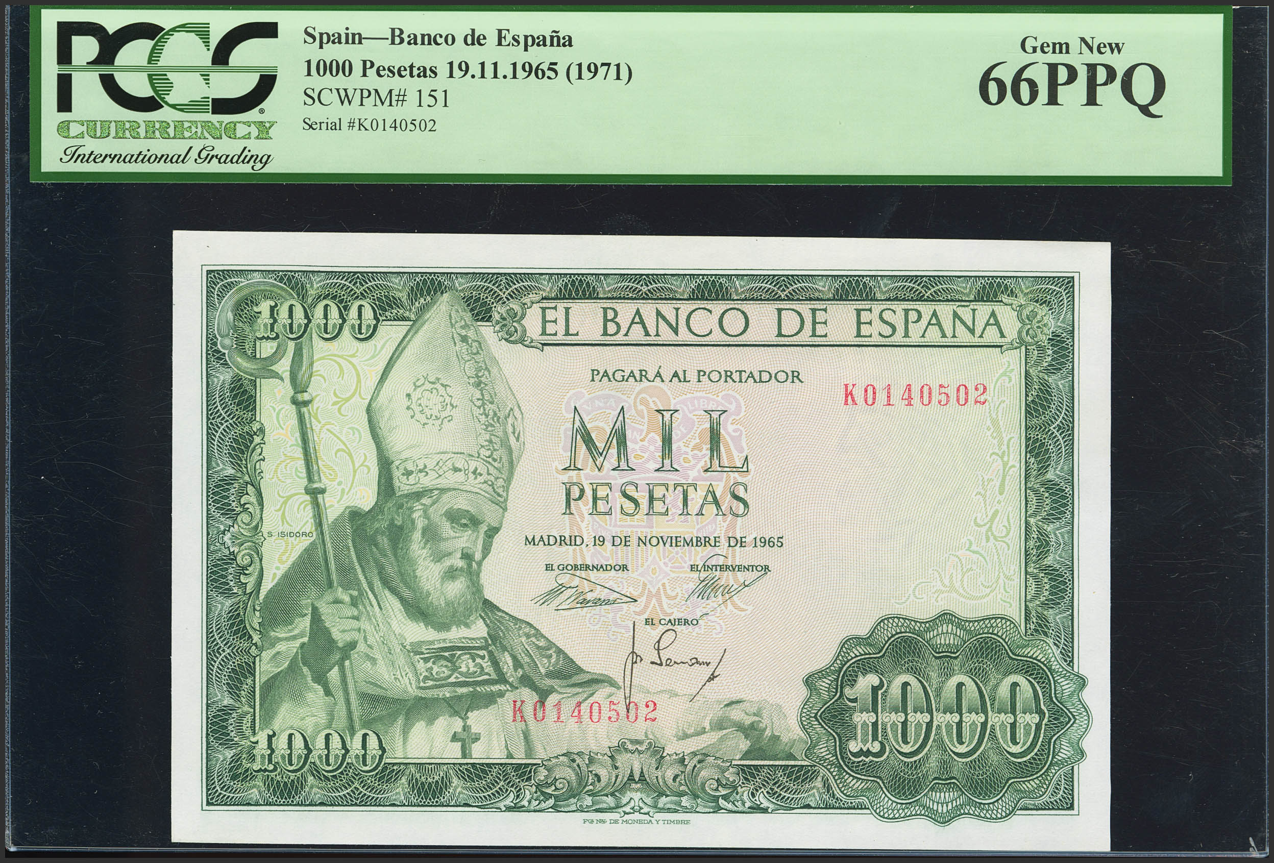 English 1000 Pesetas. November 19, 1965. Series K. (Edifil 2023: 471b, Pick: 151). Original finish. Uncirculated. PCGS66PPQ encapsulation.