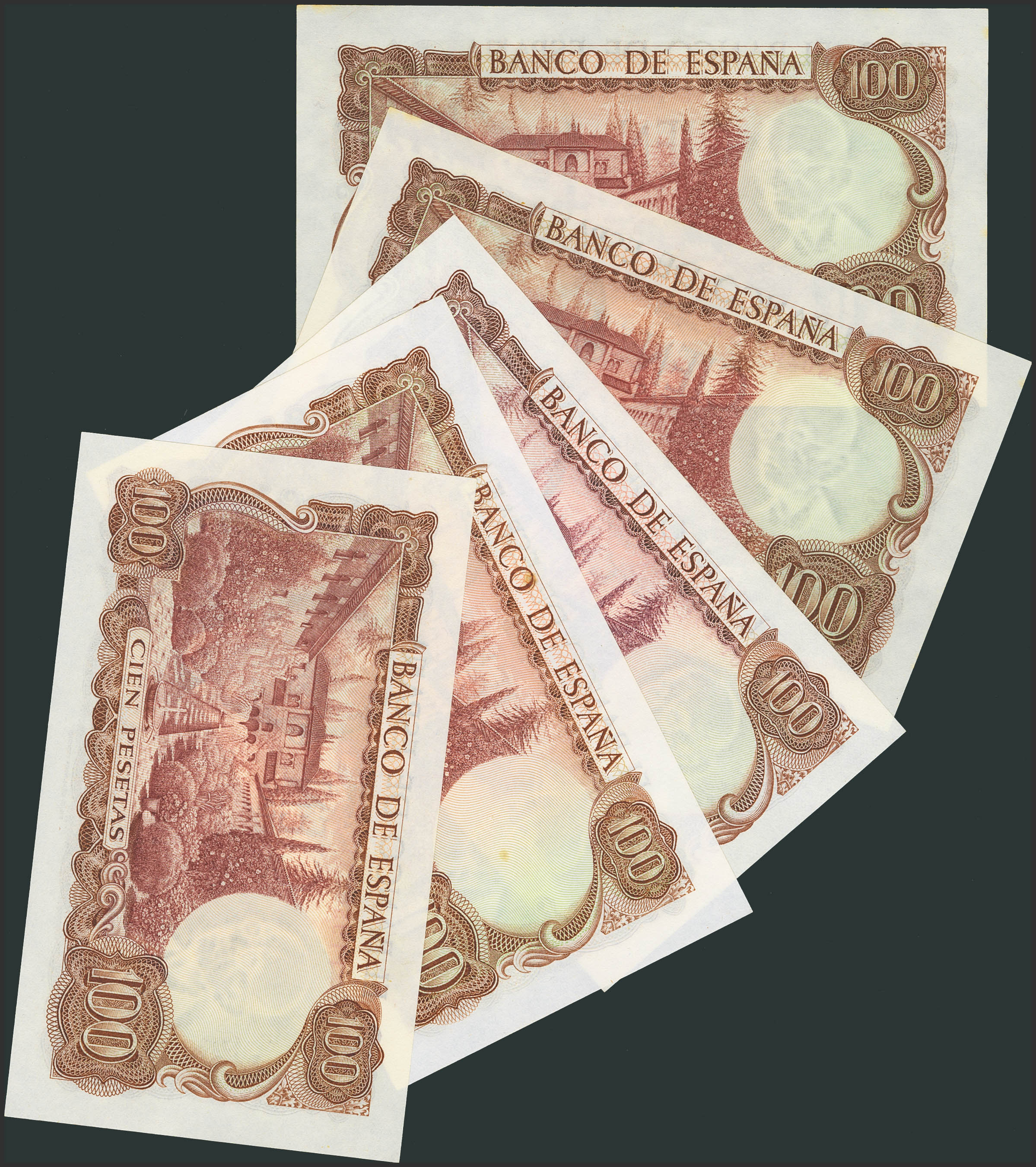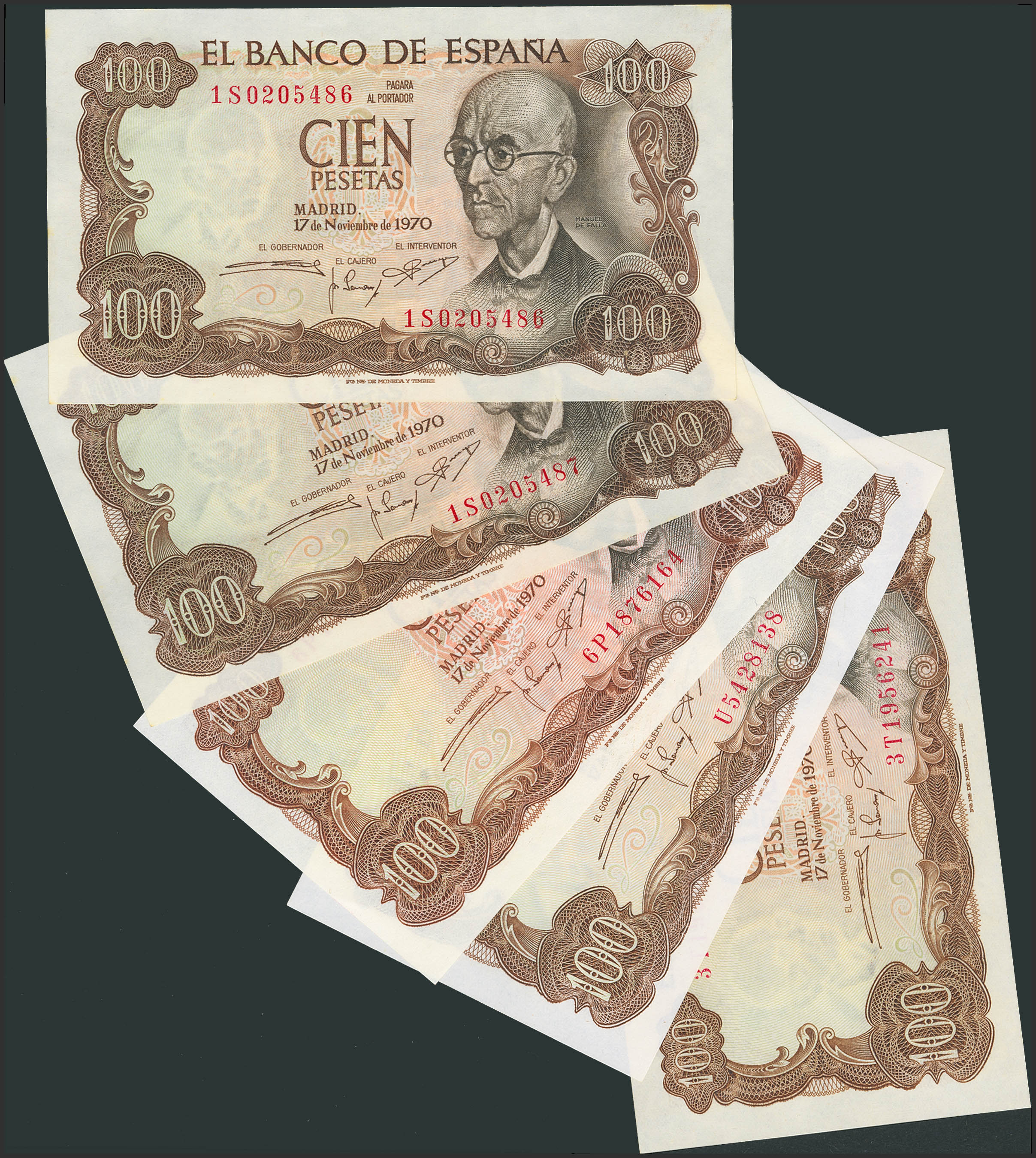 Set of 5 100 Pesetas banknotes issued on November 17, 1970, with the series 1S (consecutive pair), 6P, 3T and U. (Edifil 2023: 472b). Original condition. Uncirculated/Uncirculated--.