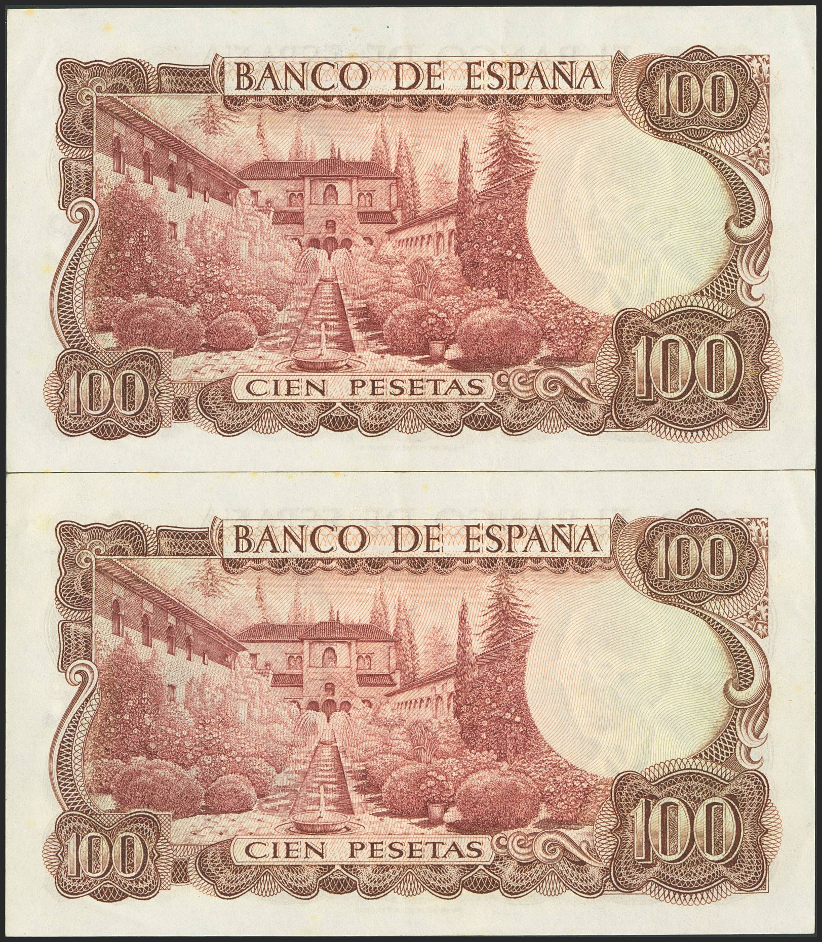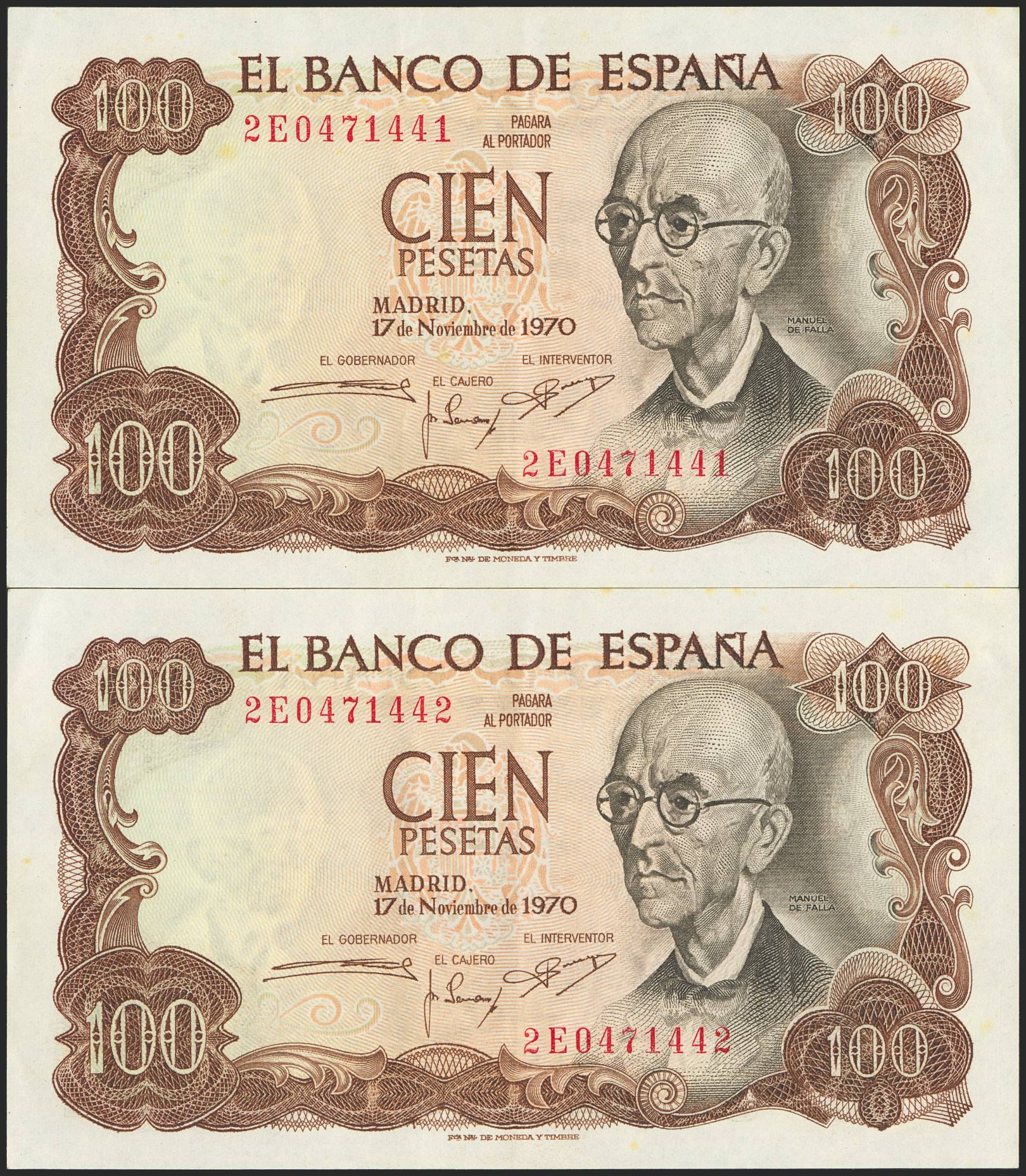 100 Pesetas. November 21, 1970. Consecutive pair. Series 2E. (Edifil 2023: 472b). Retains much of its original finish. EF+.