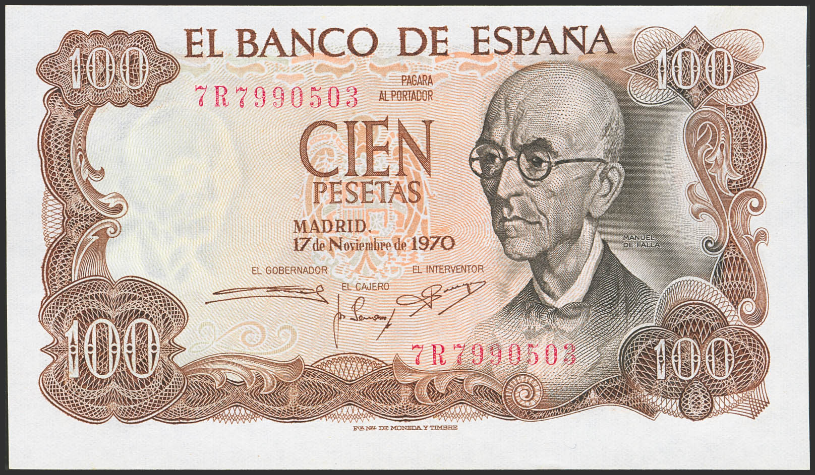 English 100 Pesetas. November 17, 1970. Series 7R. (Edifil 2023: 472b). Original finish. Uncirculated.