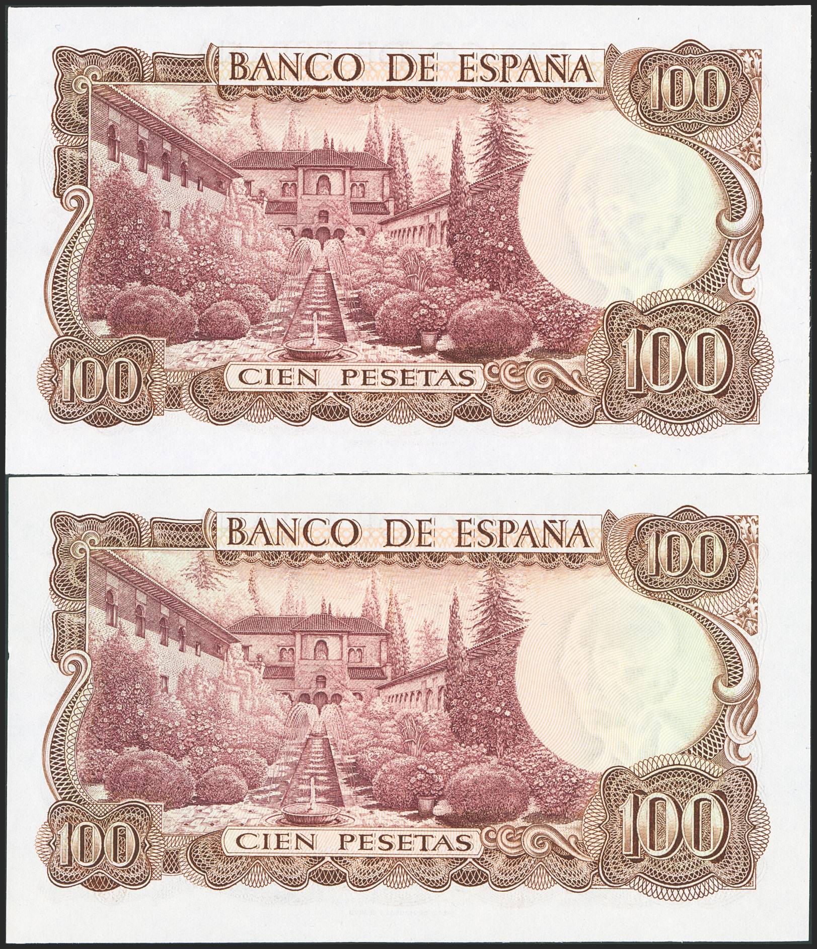 100 Pesetas. November 17, 1970. Consecutive pair. Series 7V. (Edifil 2023: 472b). Original finish. Uncirculated.