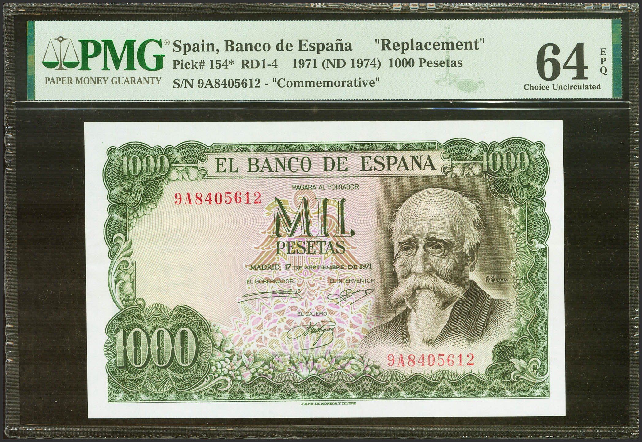 1000 Pesetas. September 17, 1971. Special Series 9A. (Edifil 2023: 474d, Pick: 154*). Rare series, original finish. Uncirculated. PMG64EPQ package.