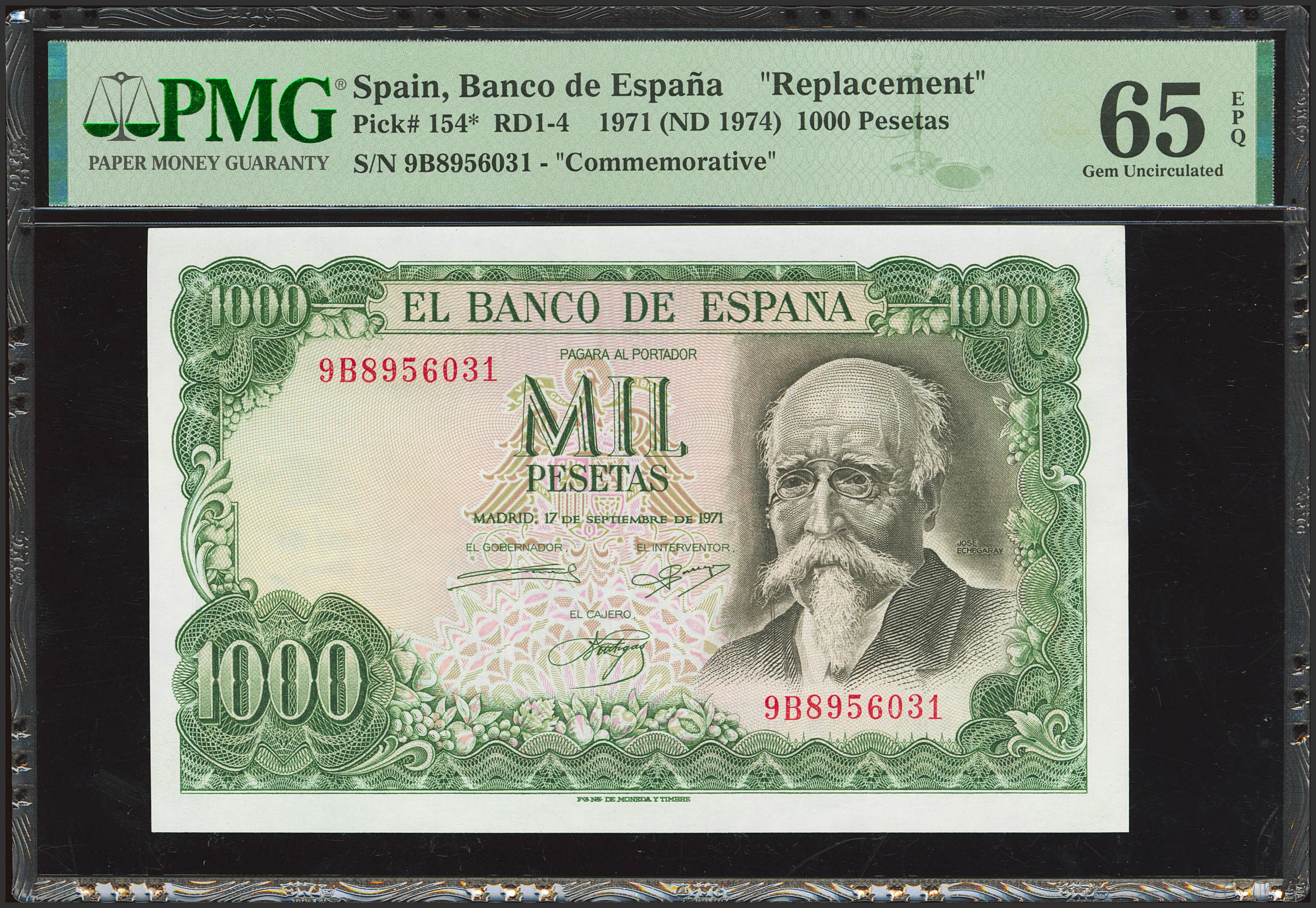 1000 Pesetas. September 17, 1971. Special Series 9B. (Edifil 2023: 474d, Pick: 154*). Uncirculated. PMG65EPQ package.
