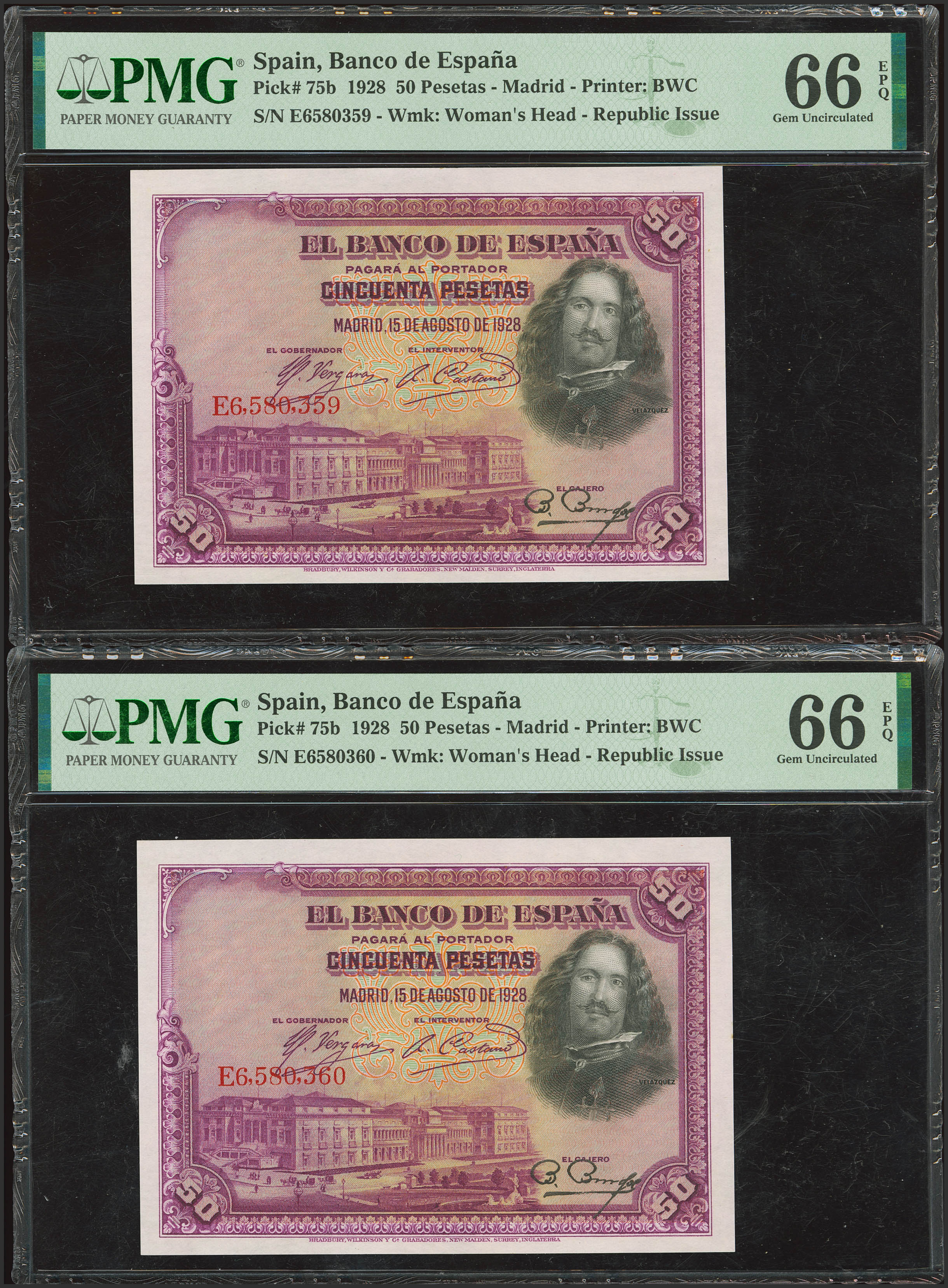 English 50 Pesetas. August 15, 1925. Consecutive pair. Series E, last series issued. (Edifil 2023: 354, Pick: 75b). Original finish. Uncirculated. PMG66EPQ capsules, both.