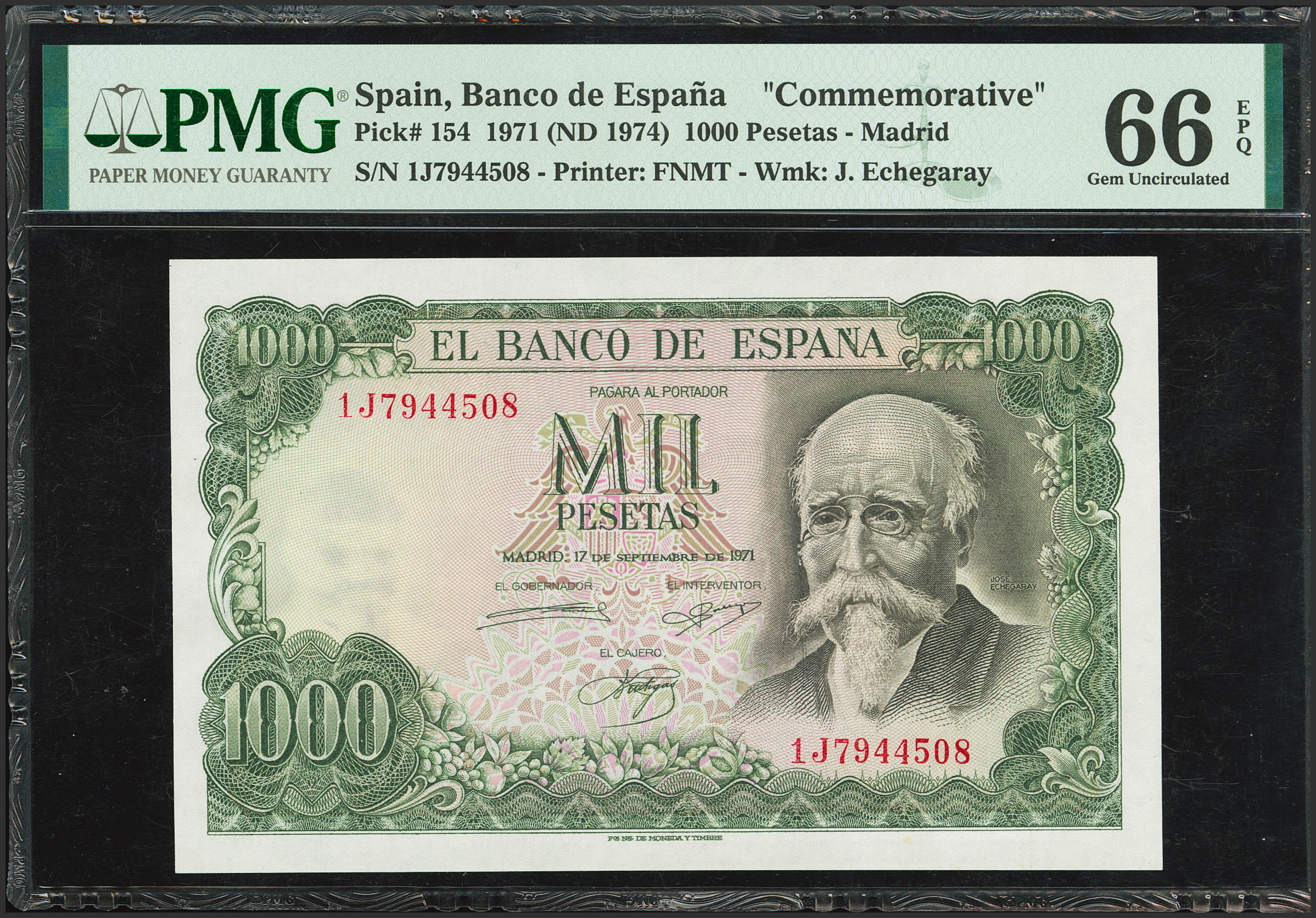English 1000 Pesetas. September 17, 1971. Series 1J. (Edifil 2023: 474c, Pick: 154). Original finish. Uncirculated. PMG66EPQ package.