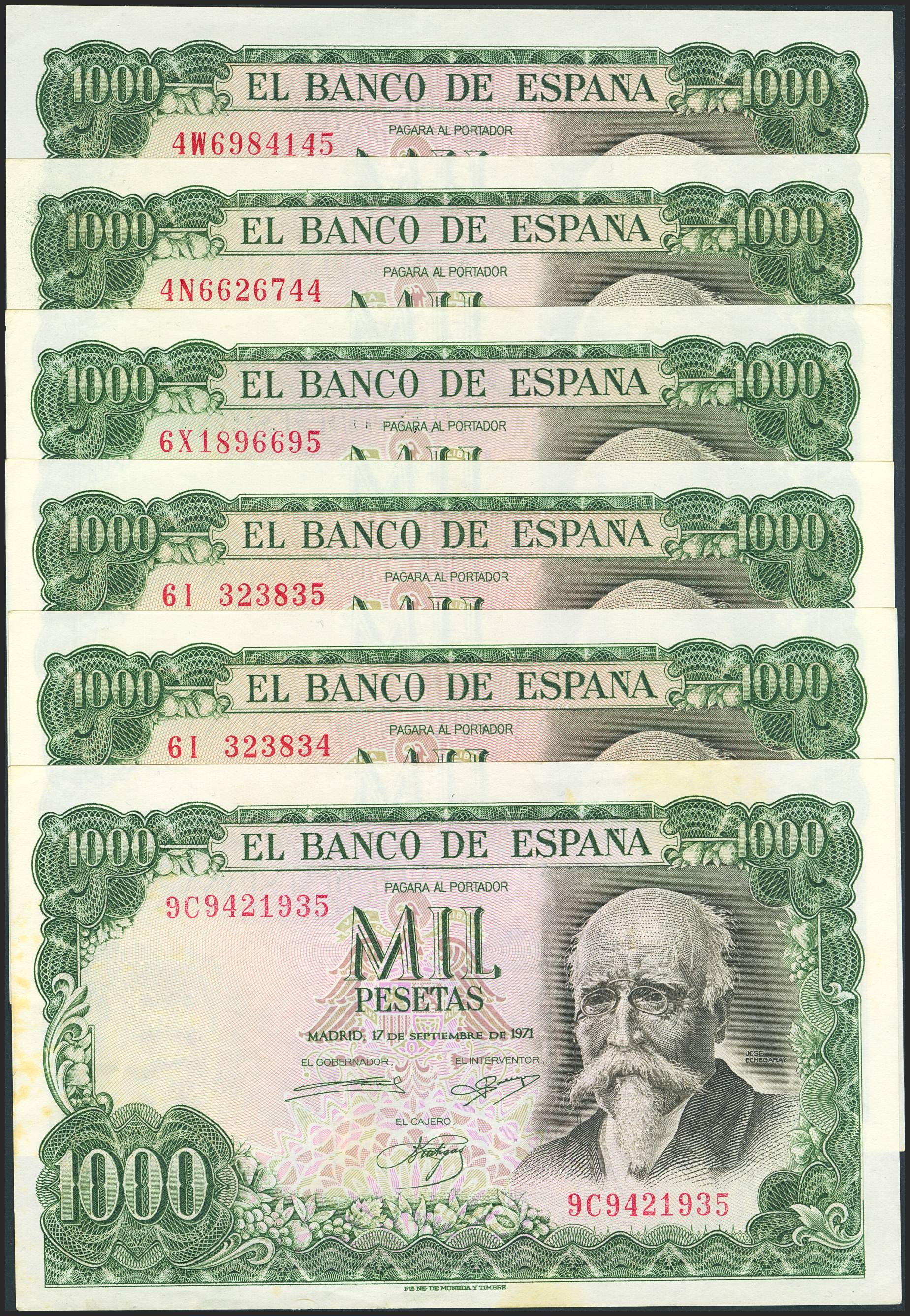 Set of 6 1000 Pesetas banknotes issued on September 17, 1971, with series 4N, 4W, 6I, 6X and the special series 9C. (Edifil 2023: 474c, 474d). TO BE EXAMINED.