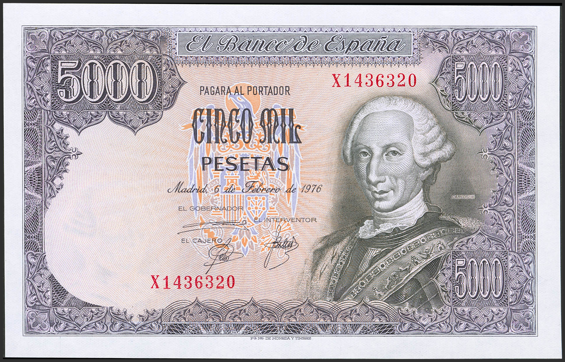 English 5000 Pesetas. February 6, 1976. Series X. (Edifil 2023: 475a). Uncirculated.