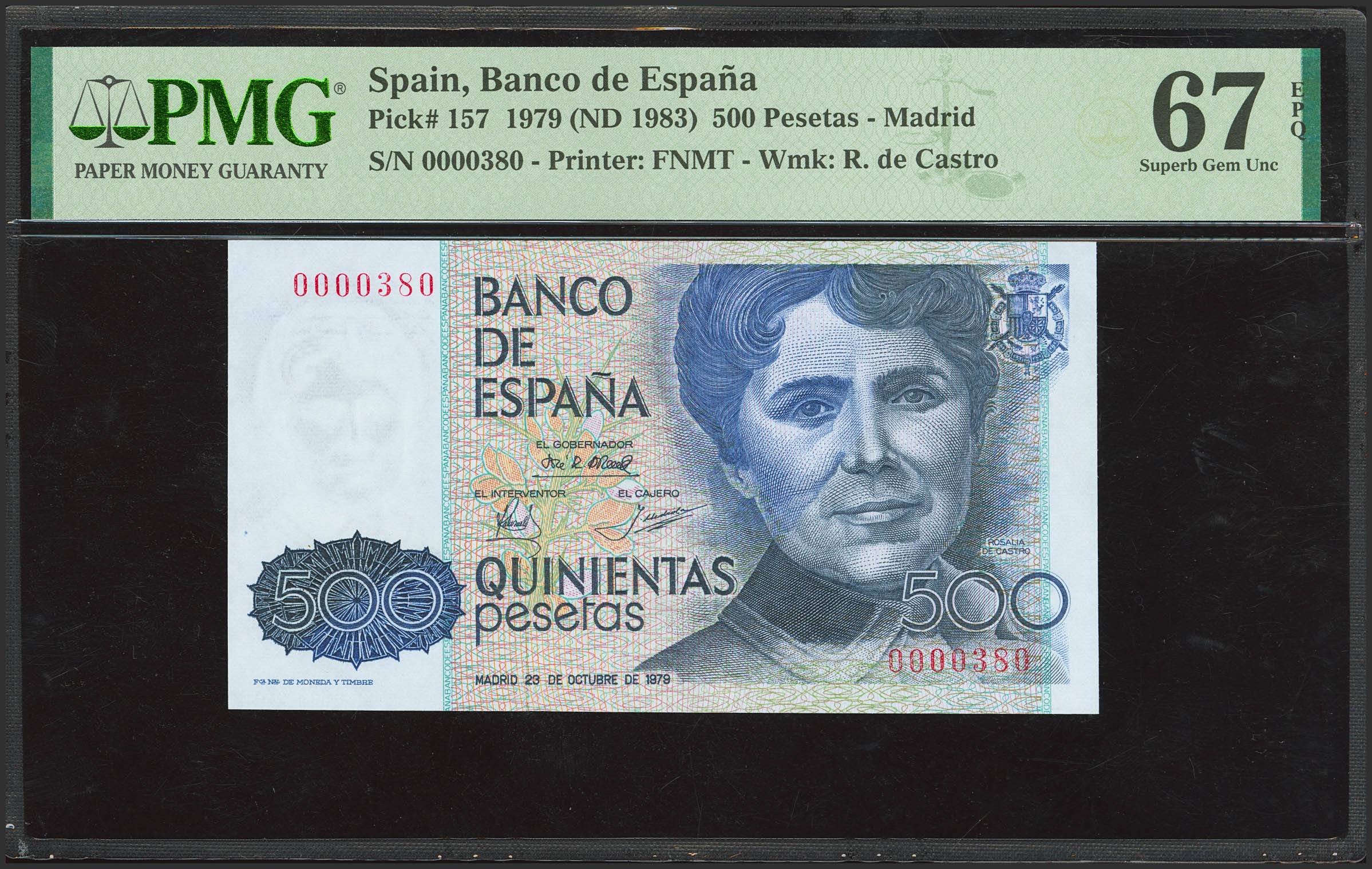 500 Pesetas. October 20, 1979. No serial number and very low serial number. (Edifil 2023: 476, Pick: 157). Uncirculated. PMG67EPQ encapsulated.