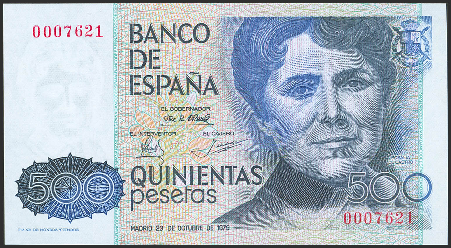 500 Pesetas. October 23, 1979. No series and very low serial number. (Edifil 2023: 476). Uncirculated.