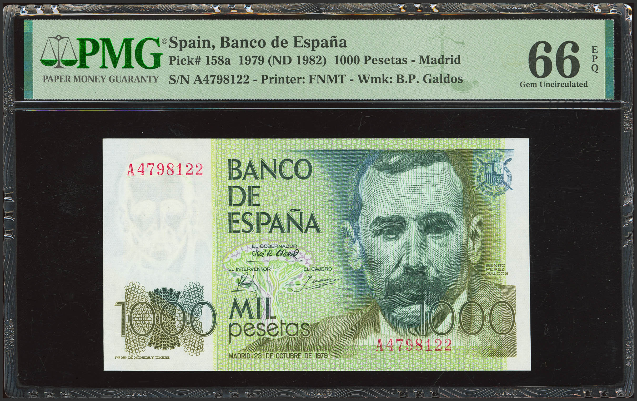 1000 Pesetas. October 23, 1979. Series A. (Edifil 2023: 477a, Pick: 158a). Uncirculated. PMG66EPQ encapsulation.