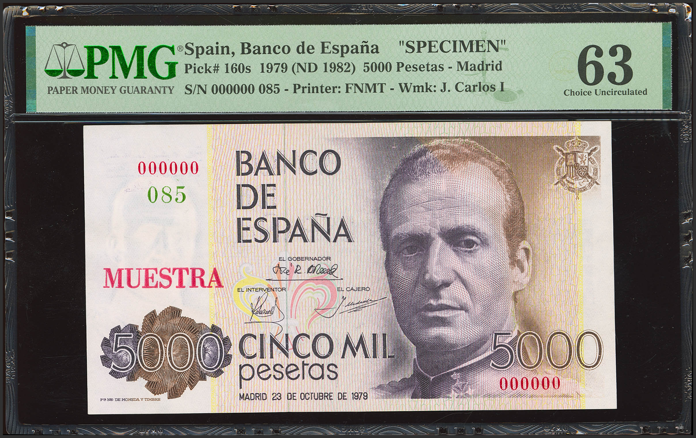 5000 Pesetas. October 23, 1979. No serial number. SAMPLE, series 085 in green and numbering 000000. (Edifil 2023: 478M). Rare. Uncirculated. PMG63 encapsulated.
