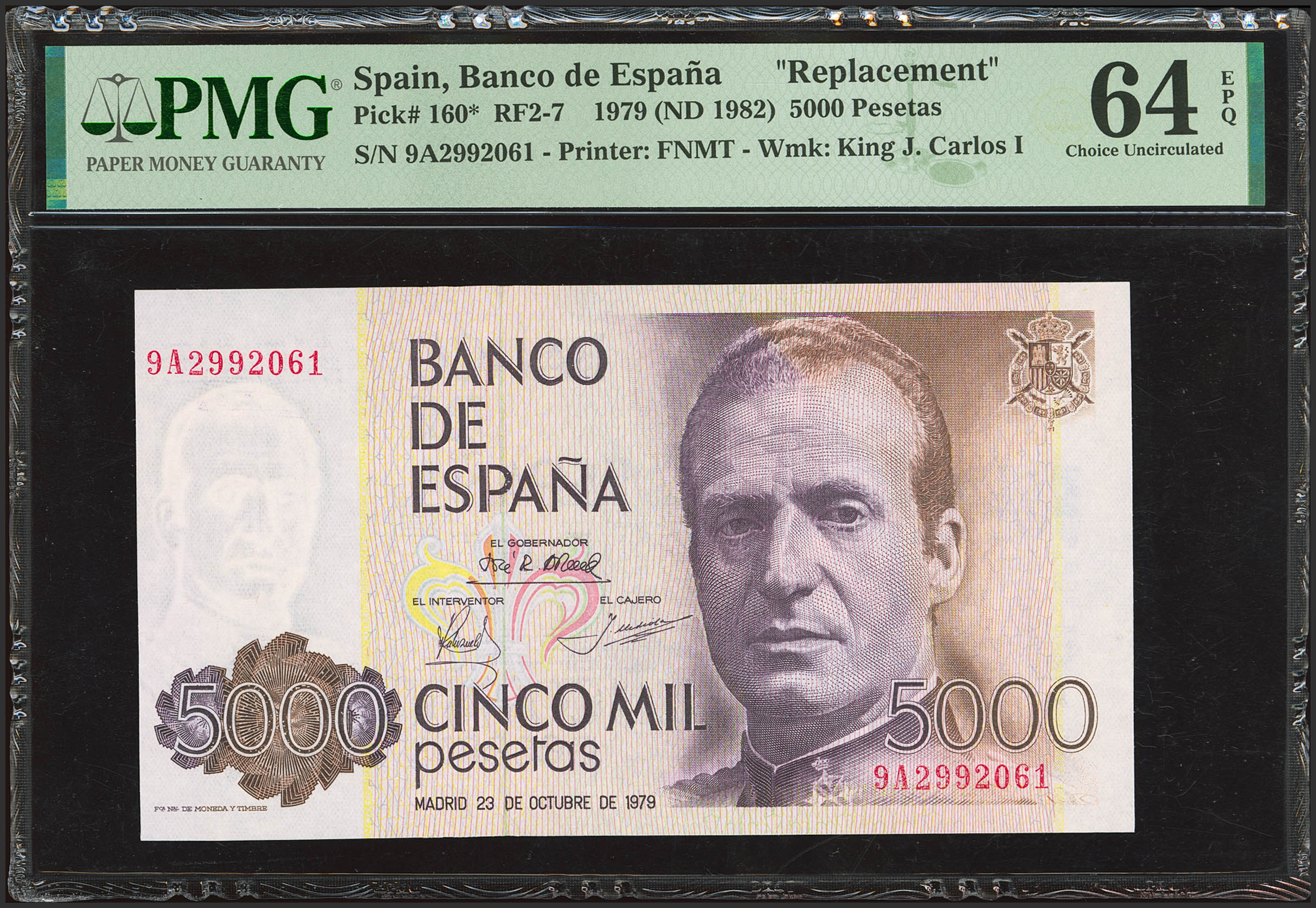 5000 Pesetas. October 23, 1979. Special Series 9A. (Edifil 2023: 478b, Pick: 160*). Uncirculated. PMG64EPQ package.