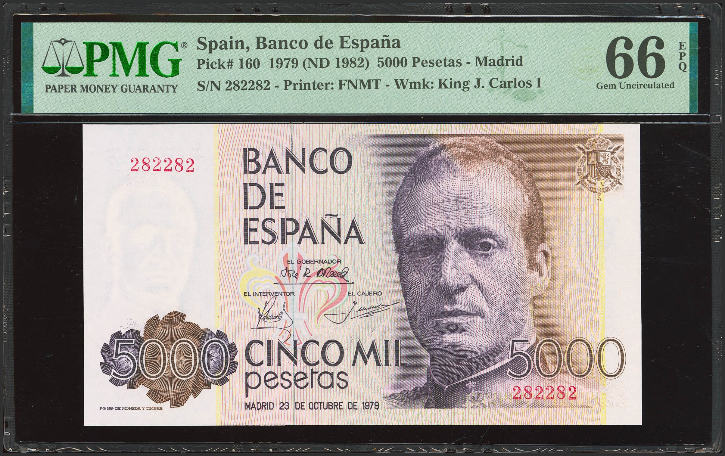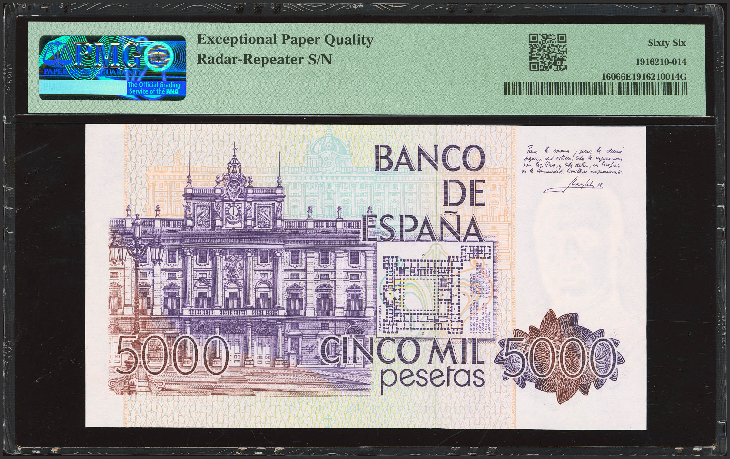5000 Pesetas. October 23, 1979. No series and palindromic numbering. (Edifil 2023: 478, Pick: 160). Uncirculated. PMG66EPQ encapsulation.