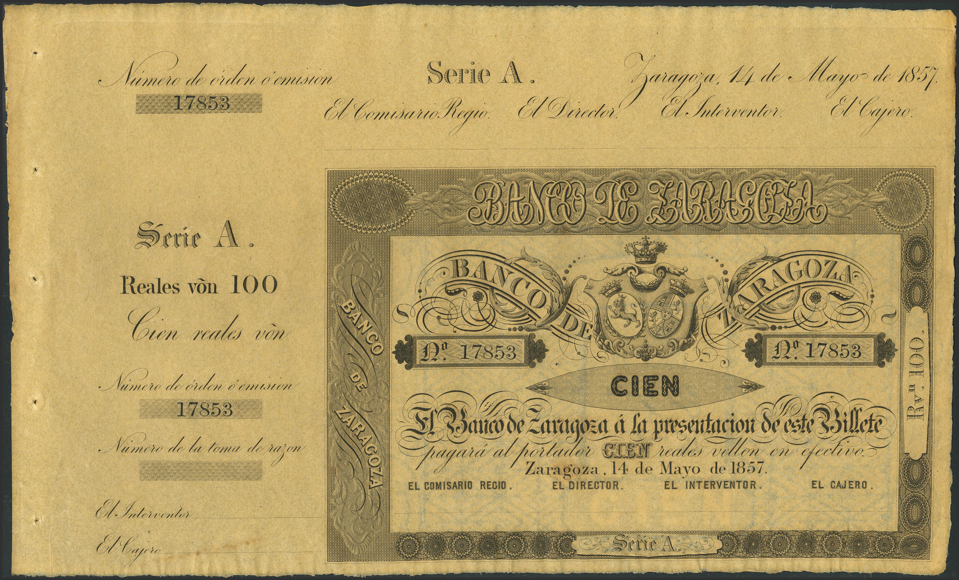 English 100 Reales. May 14, 1857. Bank of Zaragoza. Series A, with matrix. (Edifil 2023: 126B). Original finish. Uncirculated--.