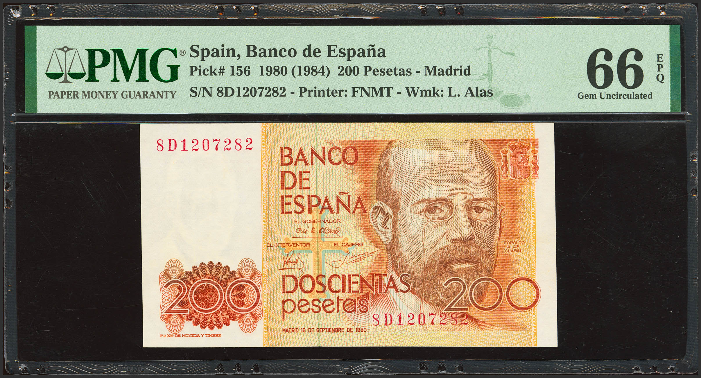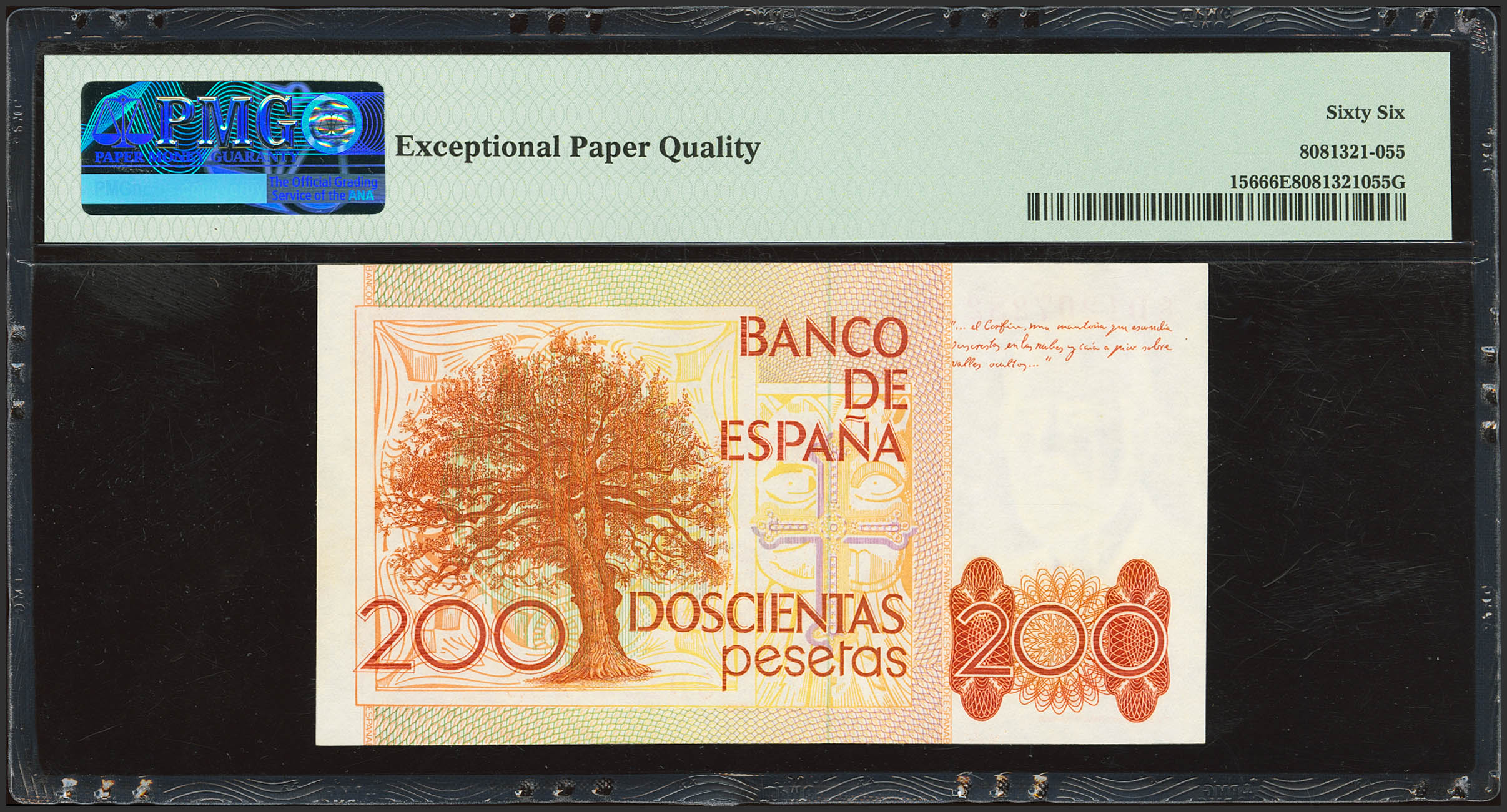 200 Pesetas. September 16, 1980. Special Series 8D. (Edifil 2023: 480g, Pick: 156). Uncirculated. PMG66EPQ encapsulated.