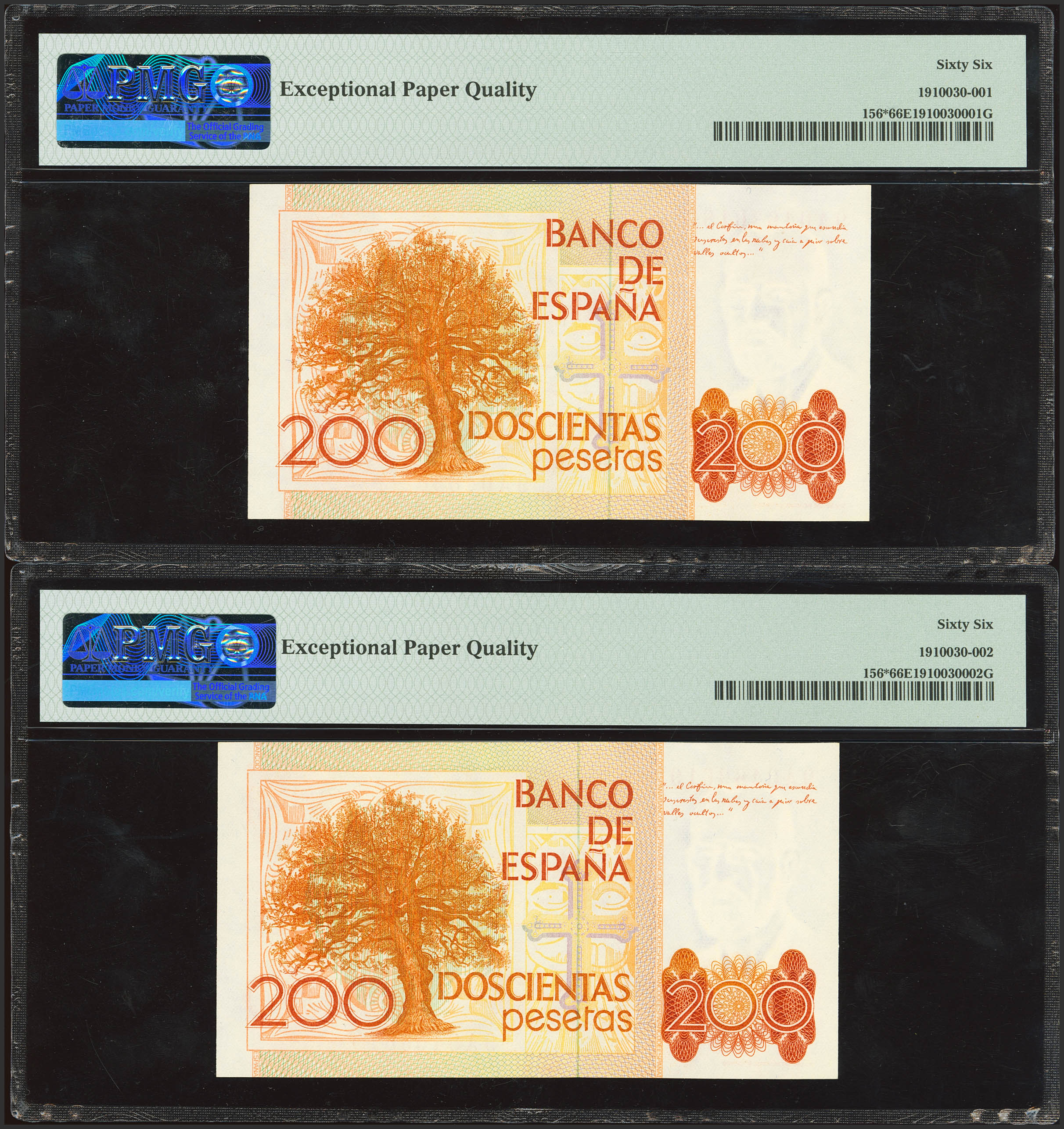 200 Pesetas. September 16, 1980. Consecutive pair. Special series 9A. (Edifil 2023: 480b, Pick: 156*). Uncirculated. PMG66EPQ capsules, both.