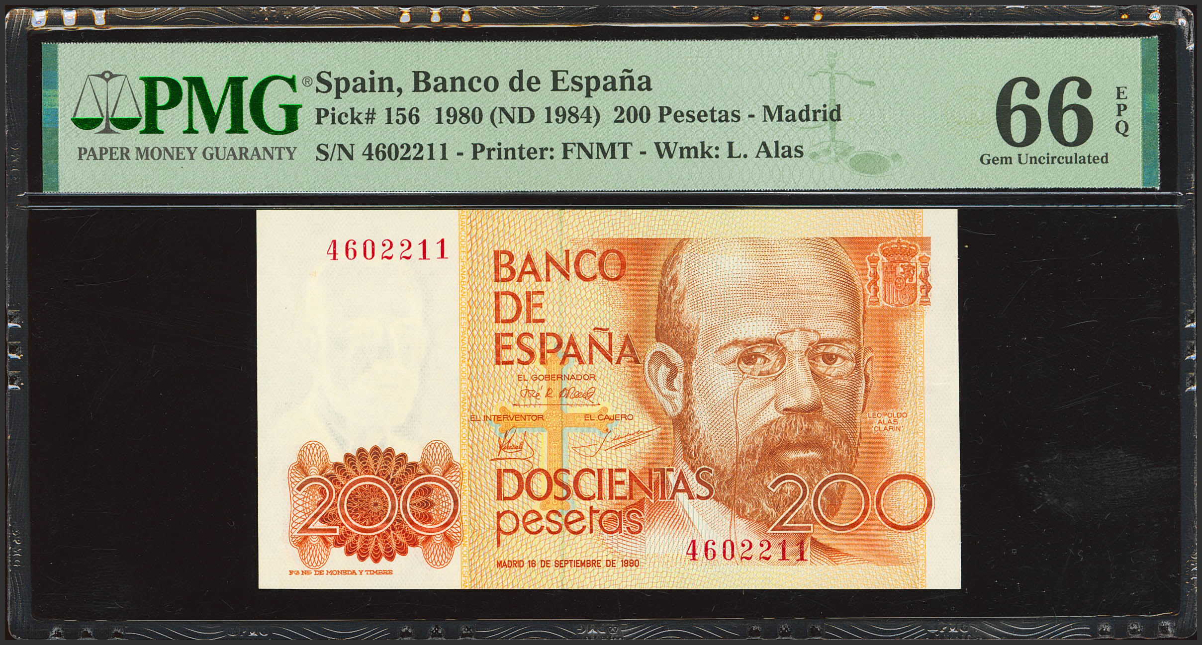 English 200 Pesetas. September 16, 1980. No serial number. (Edifil 2023: 480, Pick: 156). Uncirculated. PMG66EPQ package.