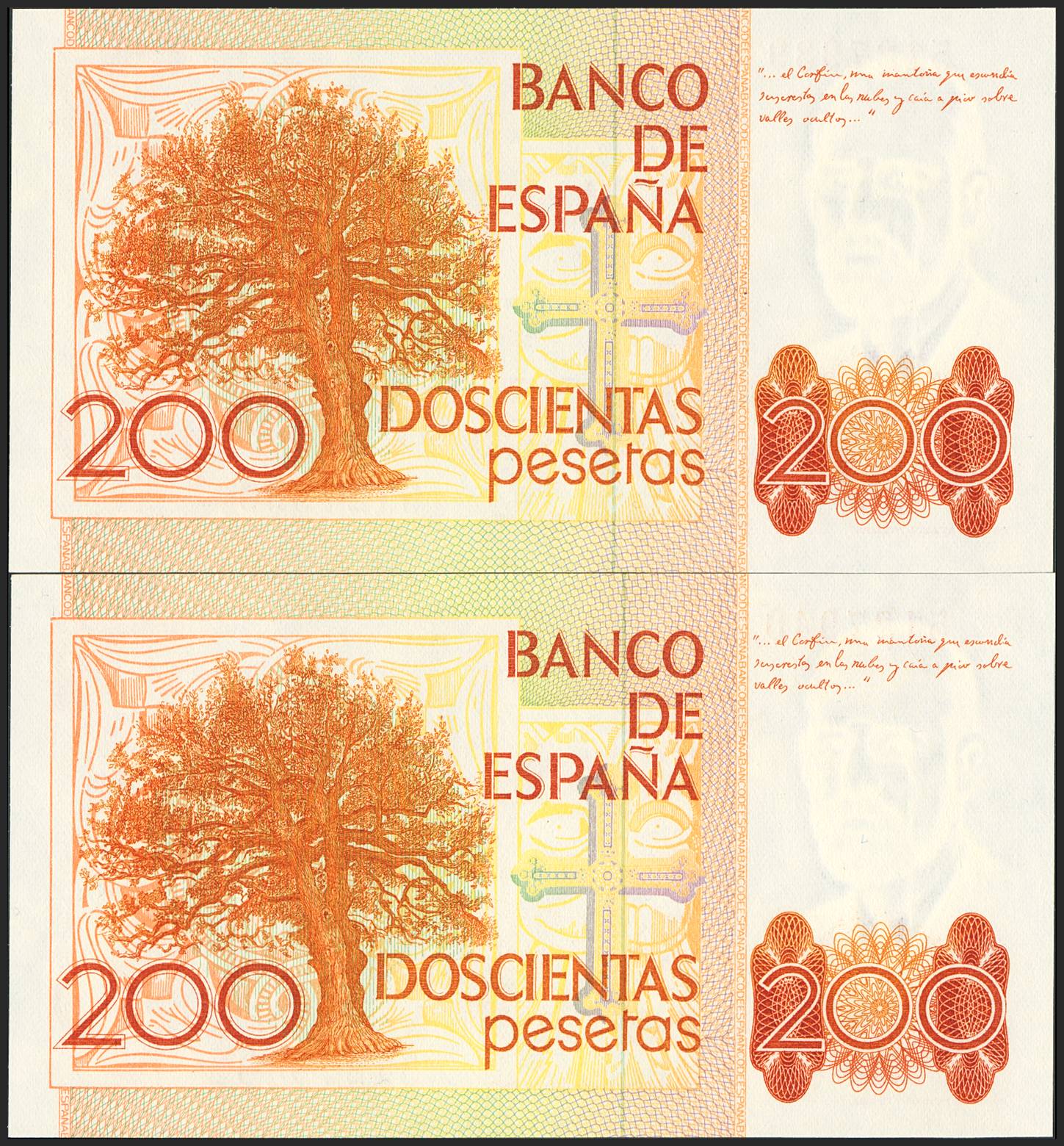 200 Pesetas. September 16, 1980. Consecutive pair. No series. (Edifil 2023: 480). Uncirculated.