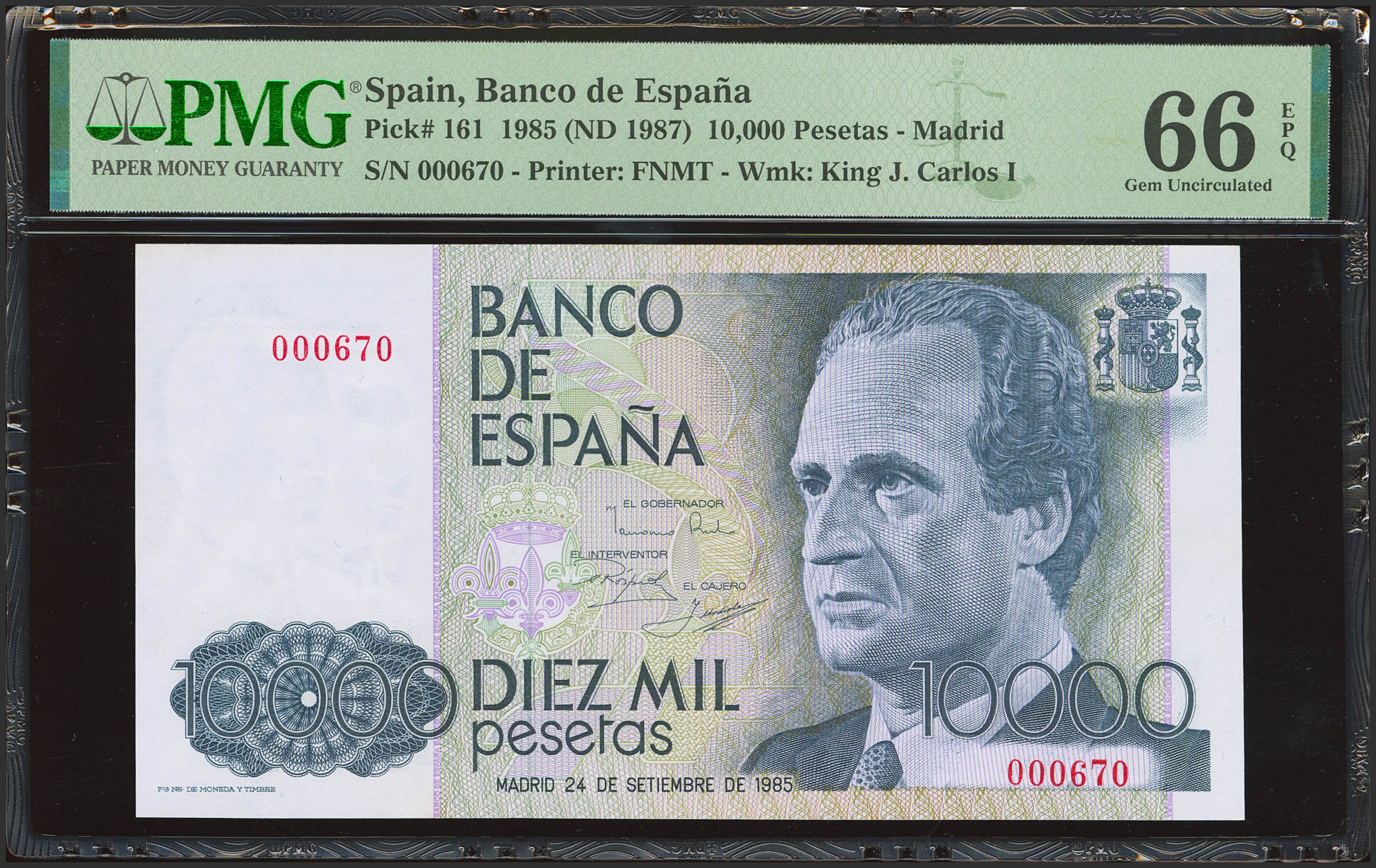 English 10,000 Pesetas. September 24, 1985. No series and very low numbering (000670). (Edifil 2023: 481, Pick: 161). Uncirculated. PMG66EPQ package.