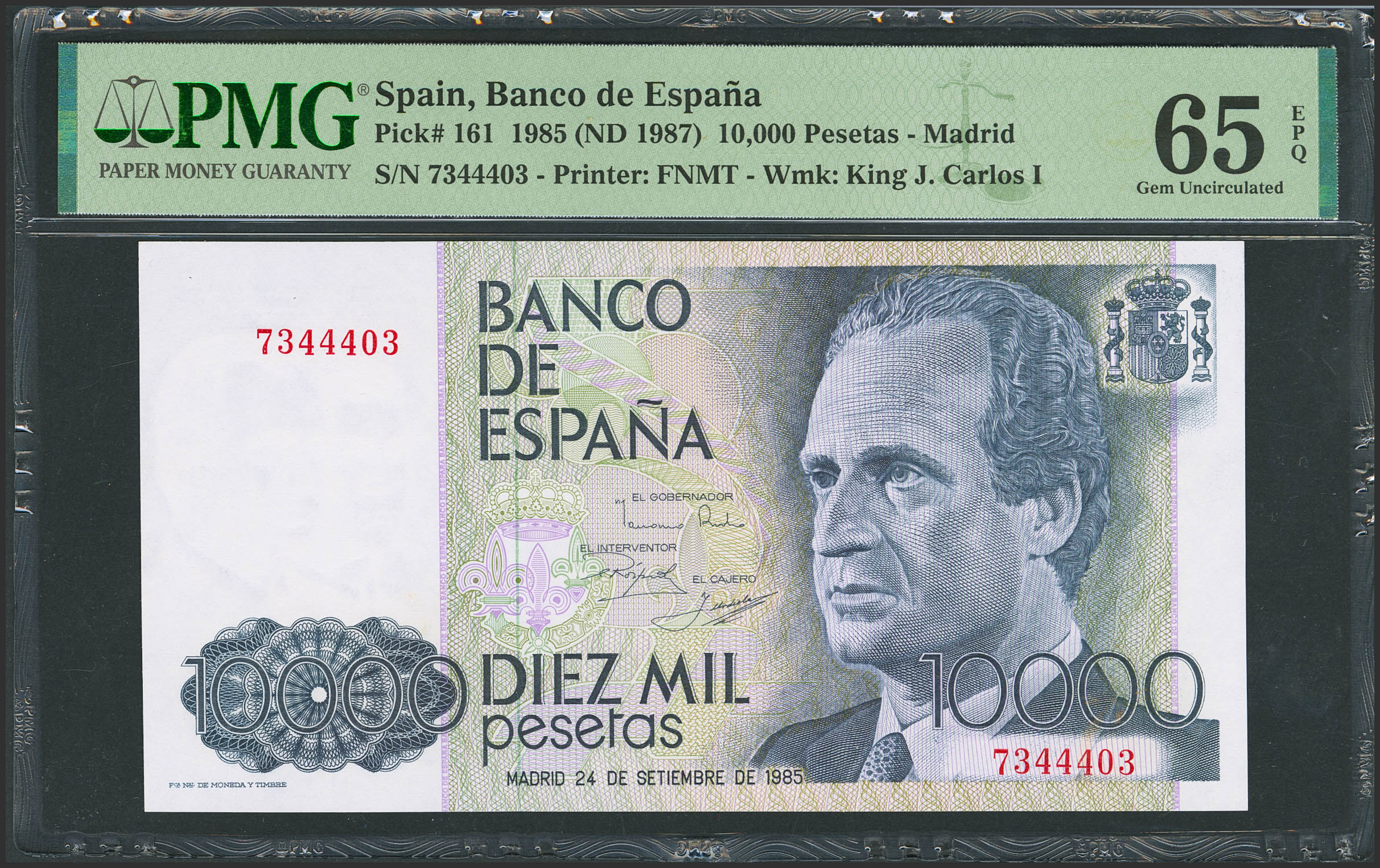 English 10,000 Pesetas. September 24, 1985. No serial number. (Edifil 2023: 481, Pick: 161). Uncirculated. PMG65EPQ package.