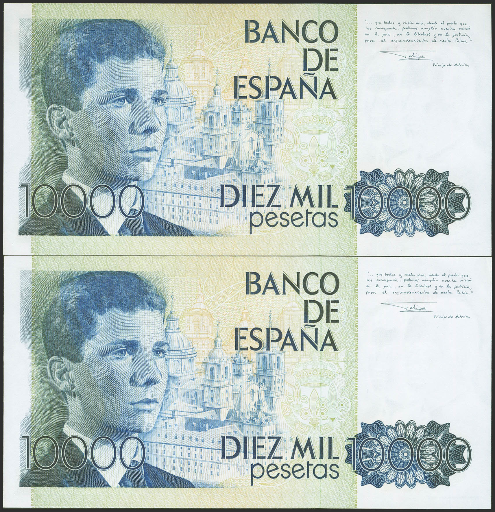 10,000 Pesetas. September 24, 1985. Consecutive pair. No series. (Edifil 2021: 481). Uncirculated-.